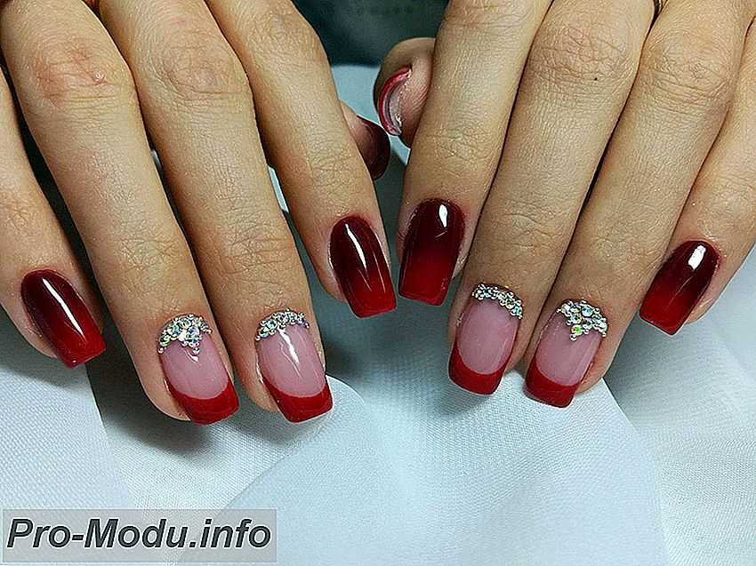 - «Омбре», или градиентный маникюр. Для него характерен плавный переход от светлых тонов к темным или же резкий – от белого к красному или синему.