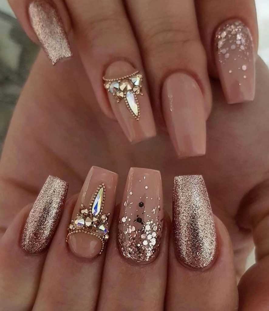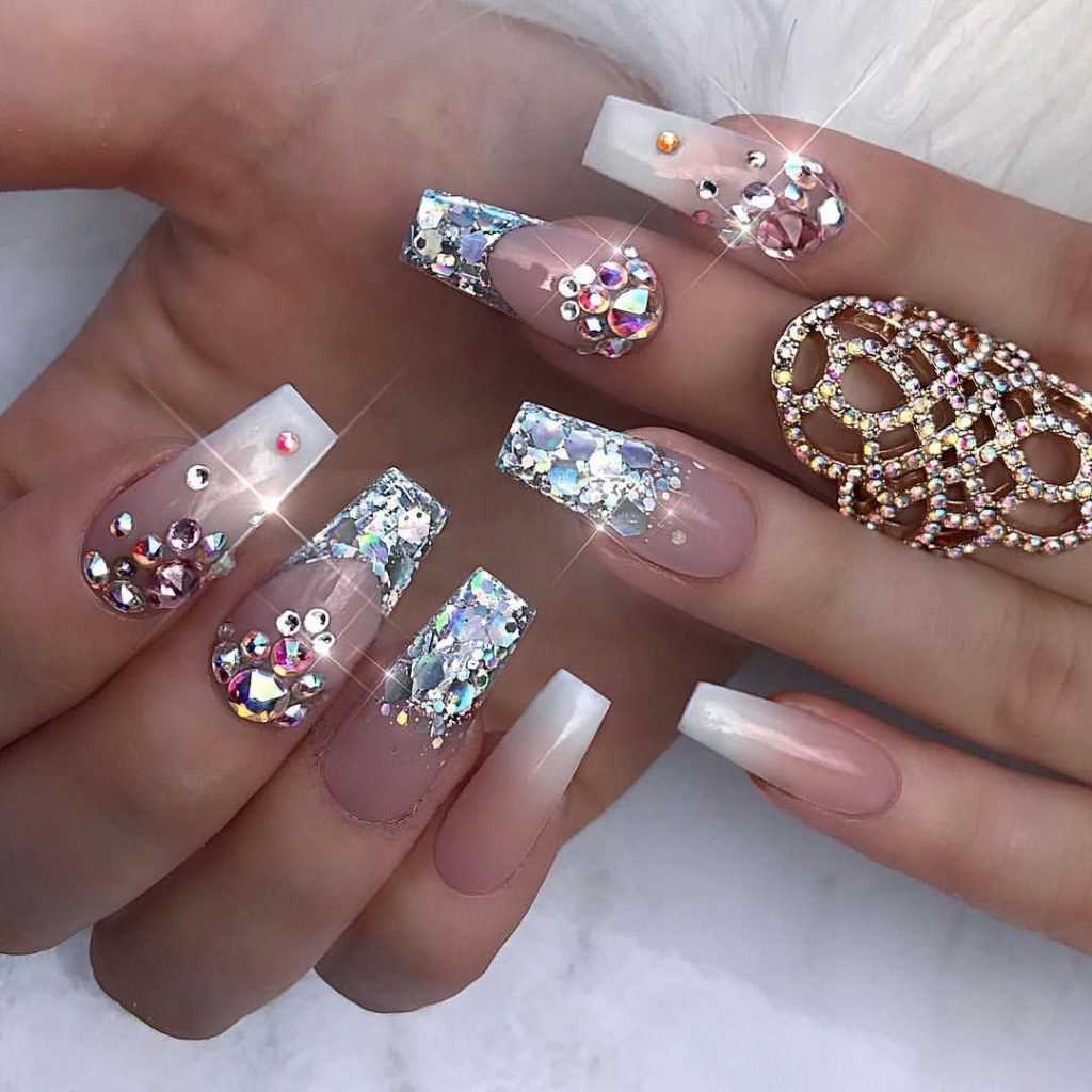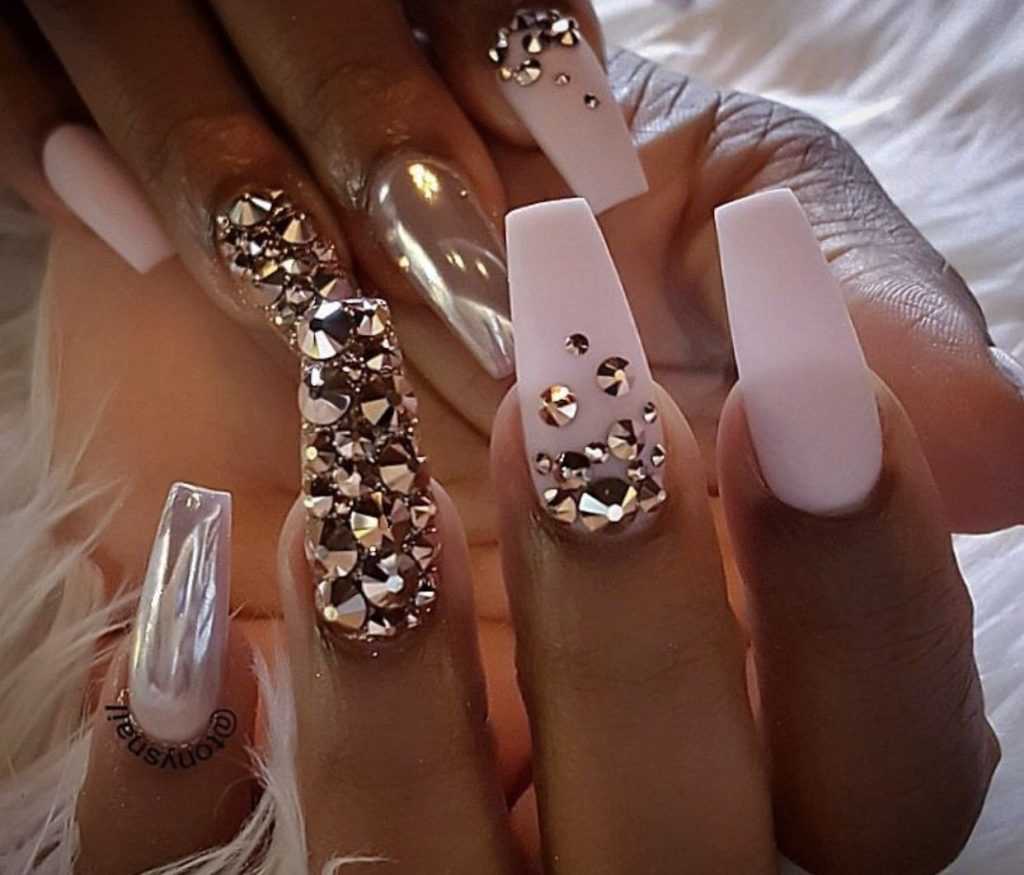 Смесь золота и серебра в каждом ногте – зимний тренд 2023 года. Маникюр принято делать объемным, поэтому можно дополнить его стразами. Чем сложнее дизайн, тем лучше.