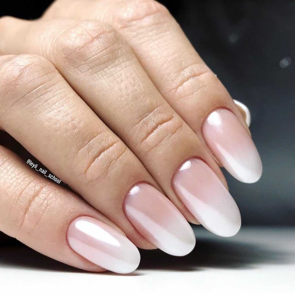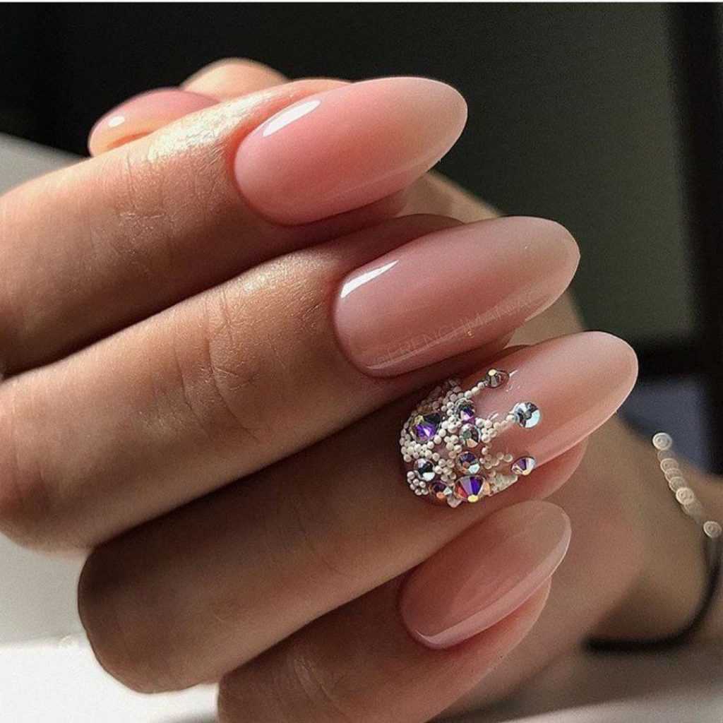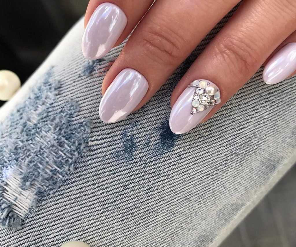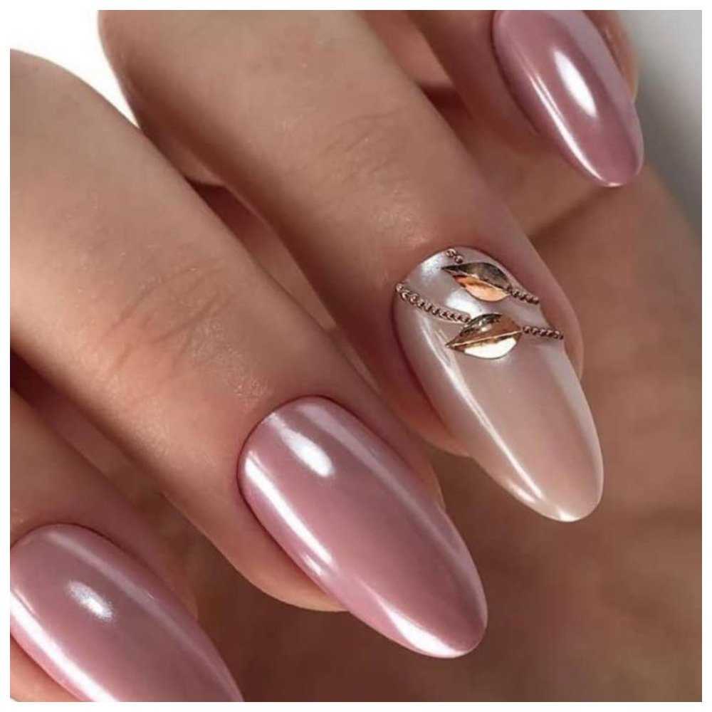 Глянцевую поверхность можно дополнить акриловой пудрой или песком, мелкими блестками или микробисером. Востребованным останется использование жемчужной или перламутровой втирки, которая сделает маникюр на овальные ногти по-настоящему сказочным и волшебным.