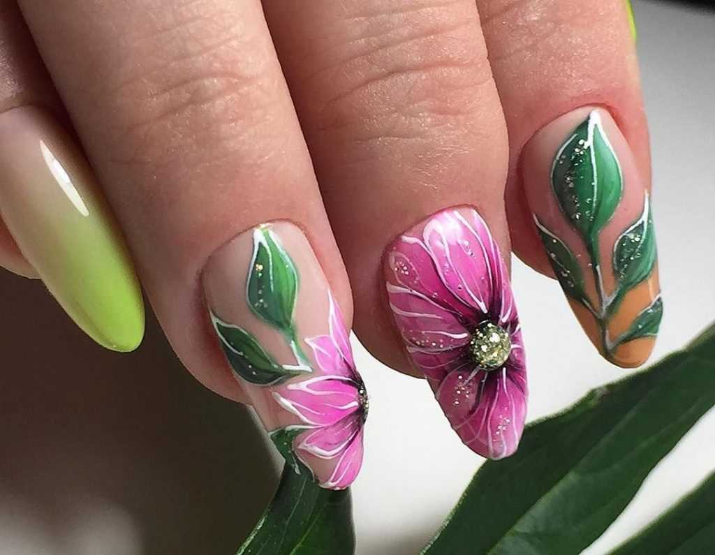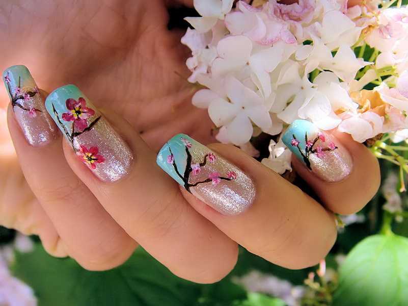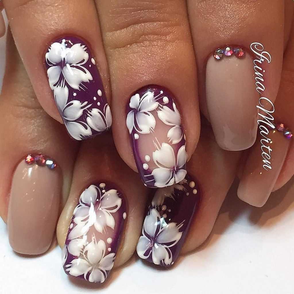 Утонченные натуры могут украсить свои ноготки рисунками с цветами — флористика в моде всегда, поскольку выглядит эстетично и женственно. Это могут быть веточки, цветки, бутоны или листочки. Попробуйте сделать необычный вариант: нарисуйте на ногтях графический цветок и дополните его хаотичными узорами.