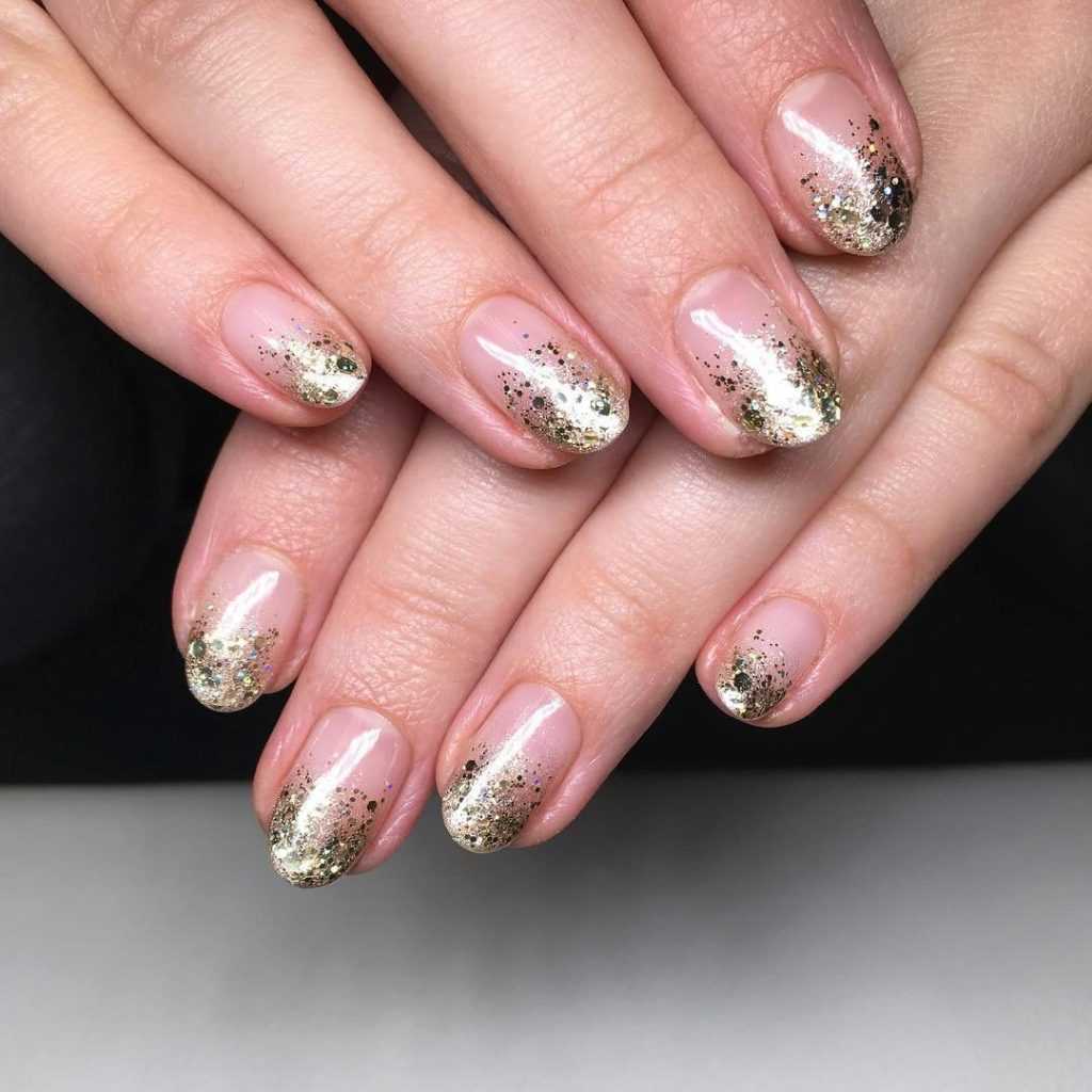 Если душа просит чего-то нового в зимнем маникюре, просто добавьте в него блесток на кончиках ногтей. Чем больше глиттера, тем эффектнее получится дизайн. Для большего эффекта можно сделать френч косым или голливудским.