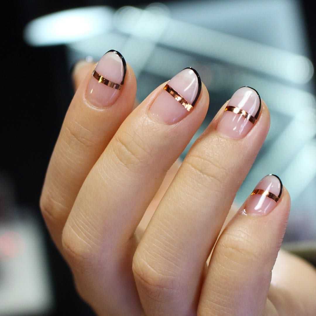 Прозрачные полоски в маникюре не редкость. Но теперь их нужно оставлять на кончиках ногтей, плотно покрывая цветом остальную часть. Выглядит такая вставка особенно хорошо с белым, перламутровым или нежно-голубым цветом.