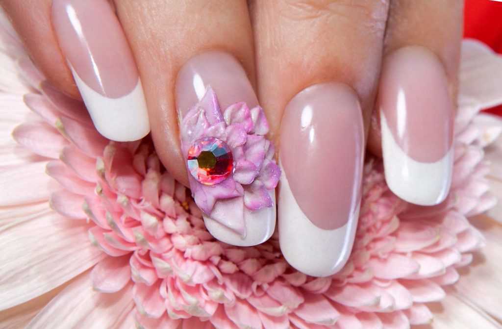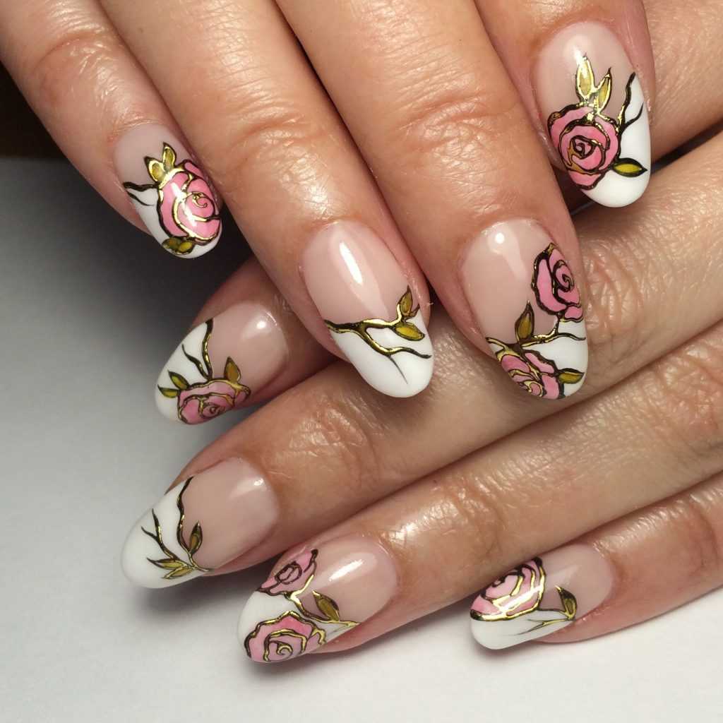 Это уже не минималистичный, а вполне полноценный сложный френч. Цветы рисуются или используются готовые аппликации на ногтевую пластину. Тон или покровный слой полностью бесцветный или чуть подкрашенный.