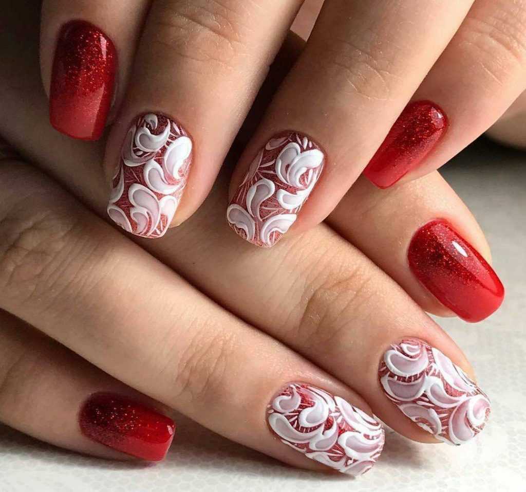 Вечерний маникюр дополняется блестками. Сохраняется мода оформлять ногти на безымянных пальцах немного иначе, чем все остальные, например: