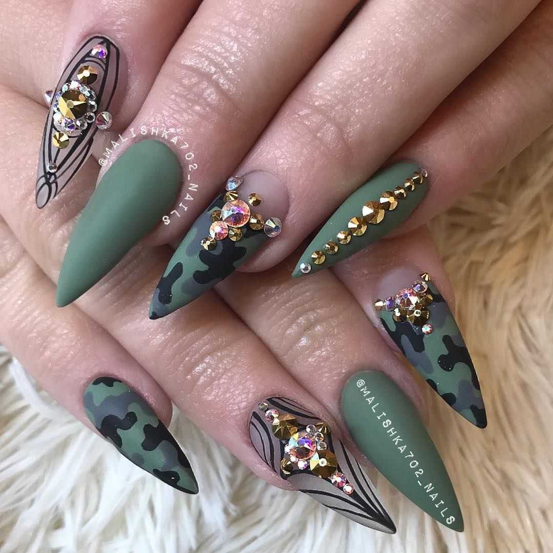 Оливковый маникюр с таким дизайном можно дополнить стразами. Здесь рекомендуется использовать небольшое количество камней, хотя можно посоветовать не слишком увлекаться камнями, так как здесь наблюдается богемный стиль.