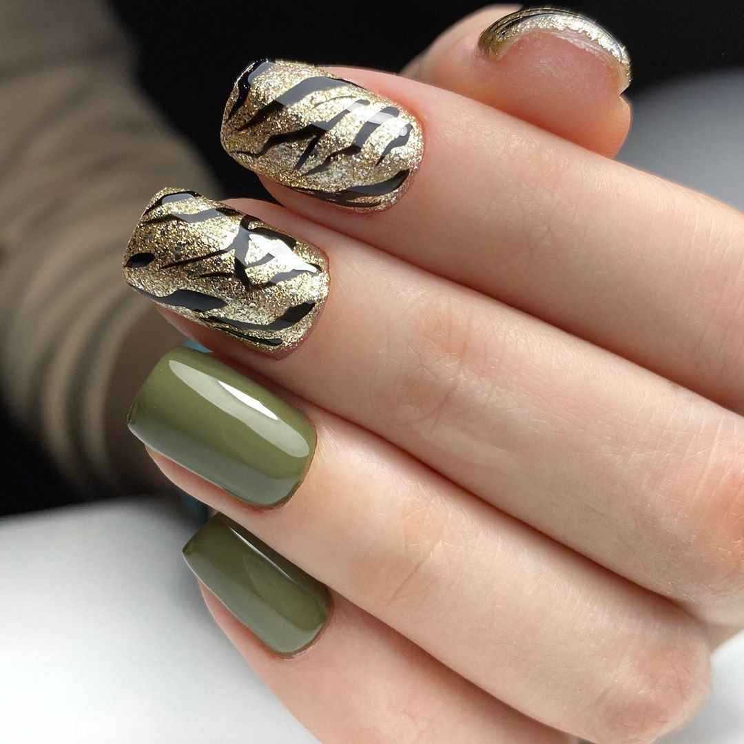 Например, сусальное золото поверх оливкового маникюра создает интересную текстуру старой, потертой золотой поверхности. Этот эффект является одной из ключевых тенденций оливкового маникюра в 2023 году.