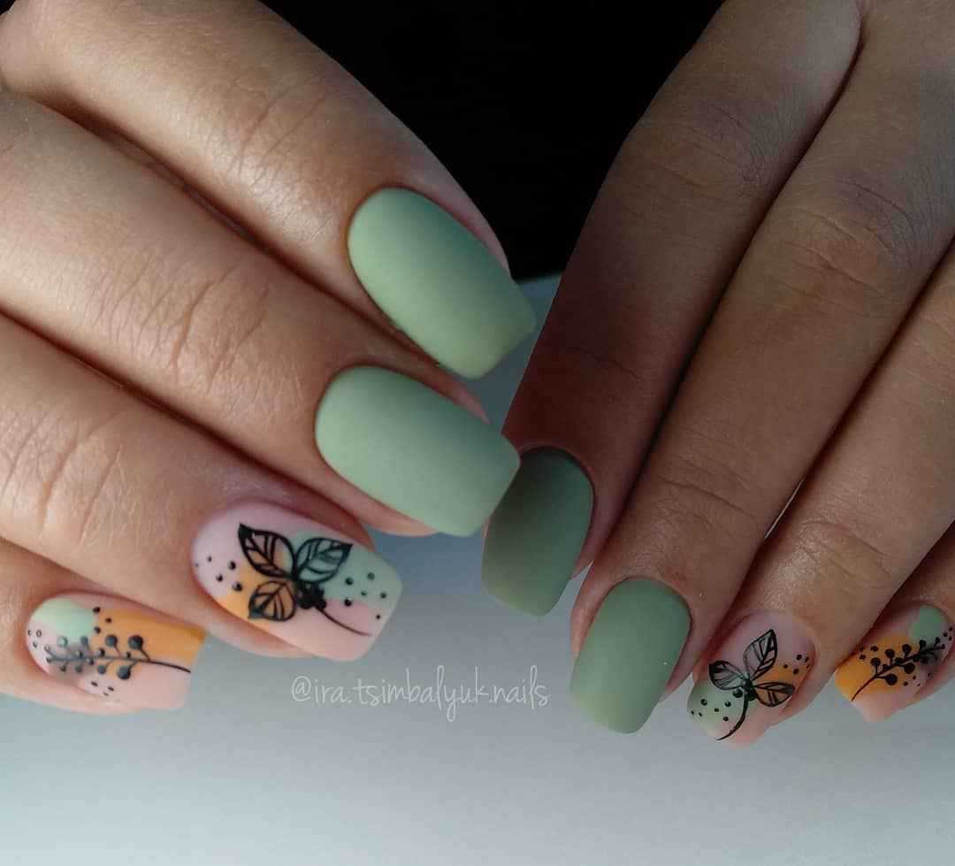 Природное нахождение цветов — среди зелени, да и сами они содержат стебель и листья зеленого цвета. Поэтому зеленый фон маникюра – отличная идея для «засаживания» цветочков и веточек. Цветы любого типа и оттенка будут смотреться на зеленом покрытии гармонично и красиво. Цветочный и веточный дизайн лучше создавать путем росписи, так эффект будет более правдоподобным и ярким. Не стоит забывать о стемпинге, наклейках, аэрографии.