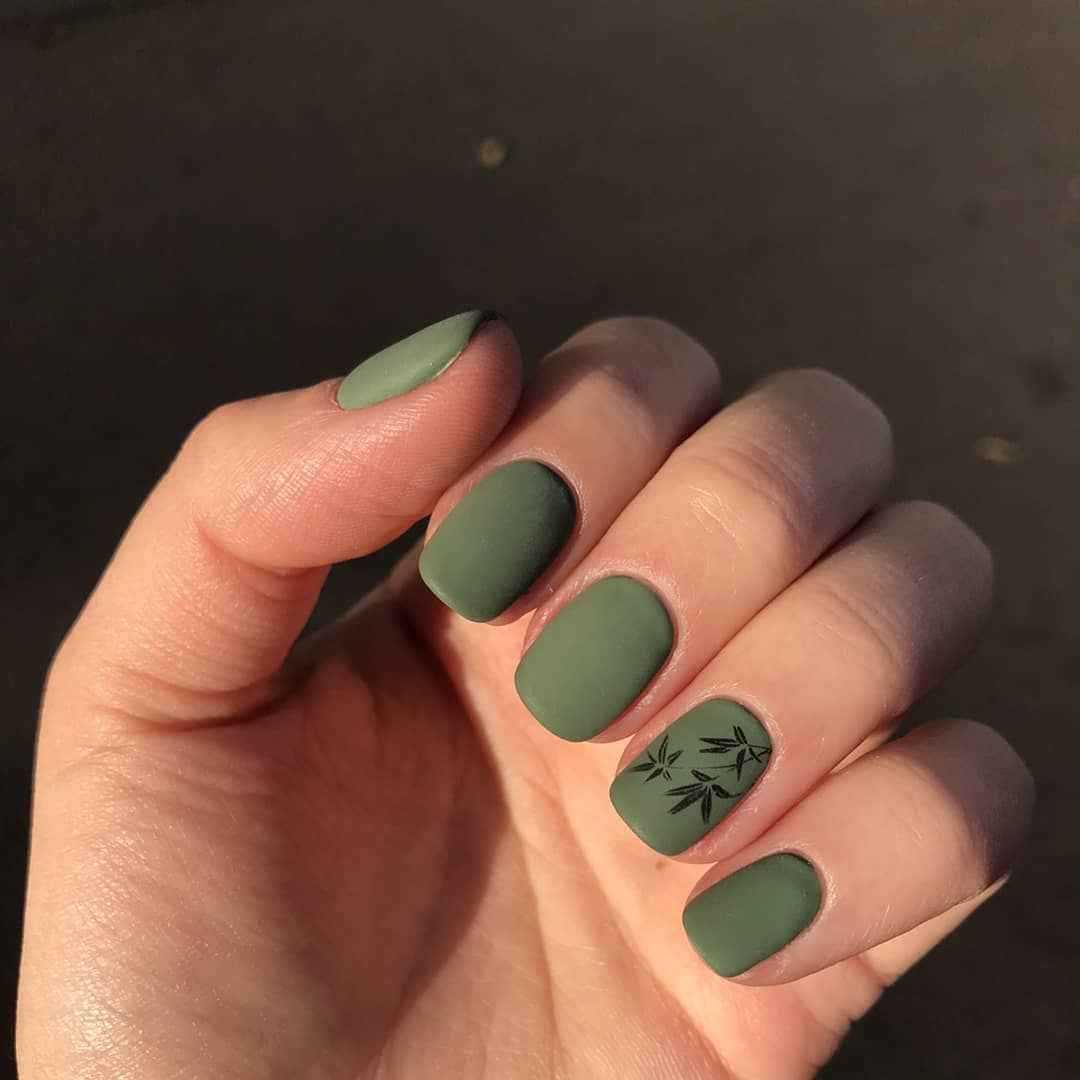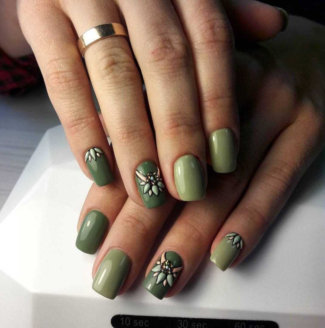 Один или два ногтя, окрашенные в более светлый оттенок молочно-белого, будут прекрасно сочетаться с оливковым маникюром. Сверху будут нанесены цветочные узоры.