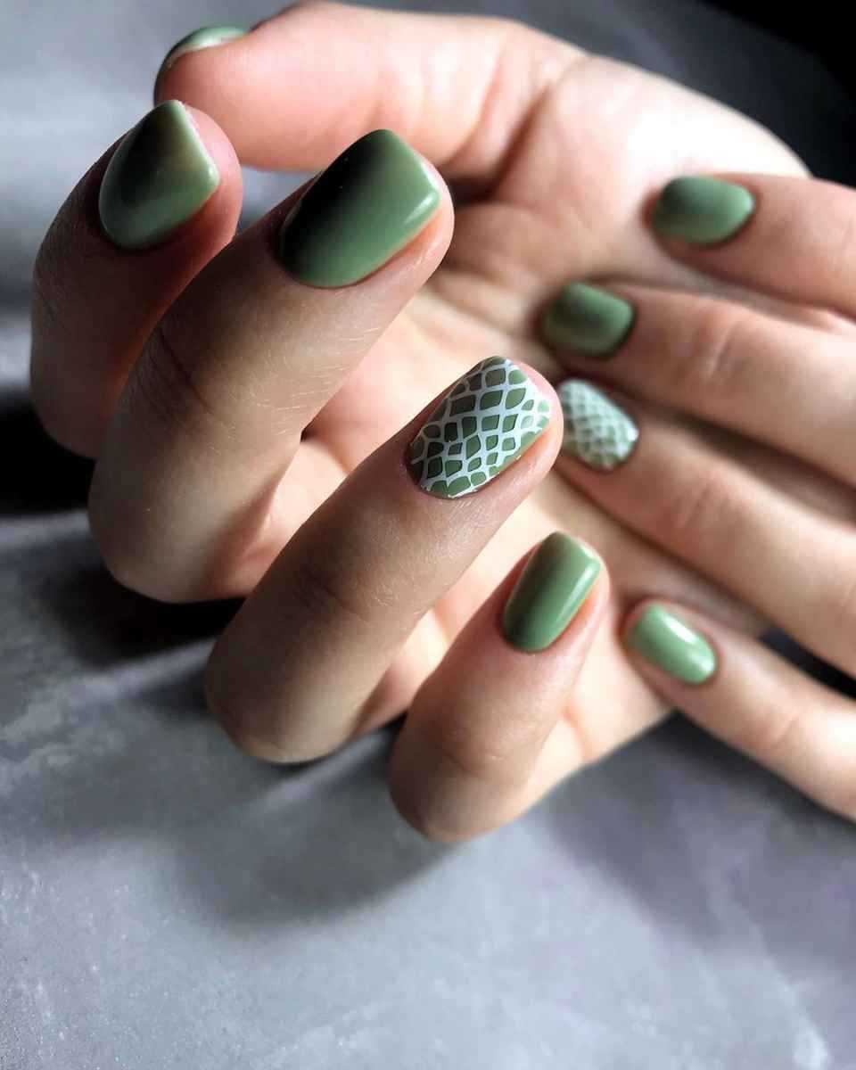 Рисунки молочного цвета на оливковых ногтях – еще одно модное сочетание в индустрии дизайна ногтей.