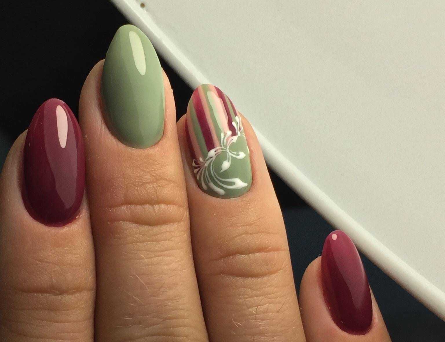 Комбинация оливы с вишневыми оттенками кажется нестандартной и тяжелой. Но если дополнить белыми деталями, то маникюр получится значительно веселее. А вот сочетание цветов с черным наоборот – придаст респектабельности. Подойдет для женского образа более старшего возраста.