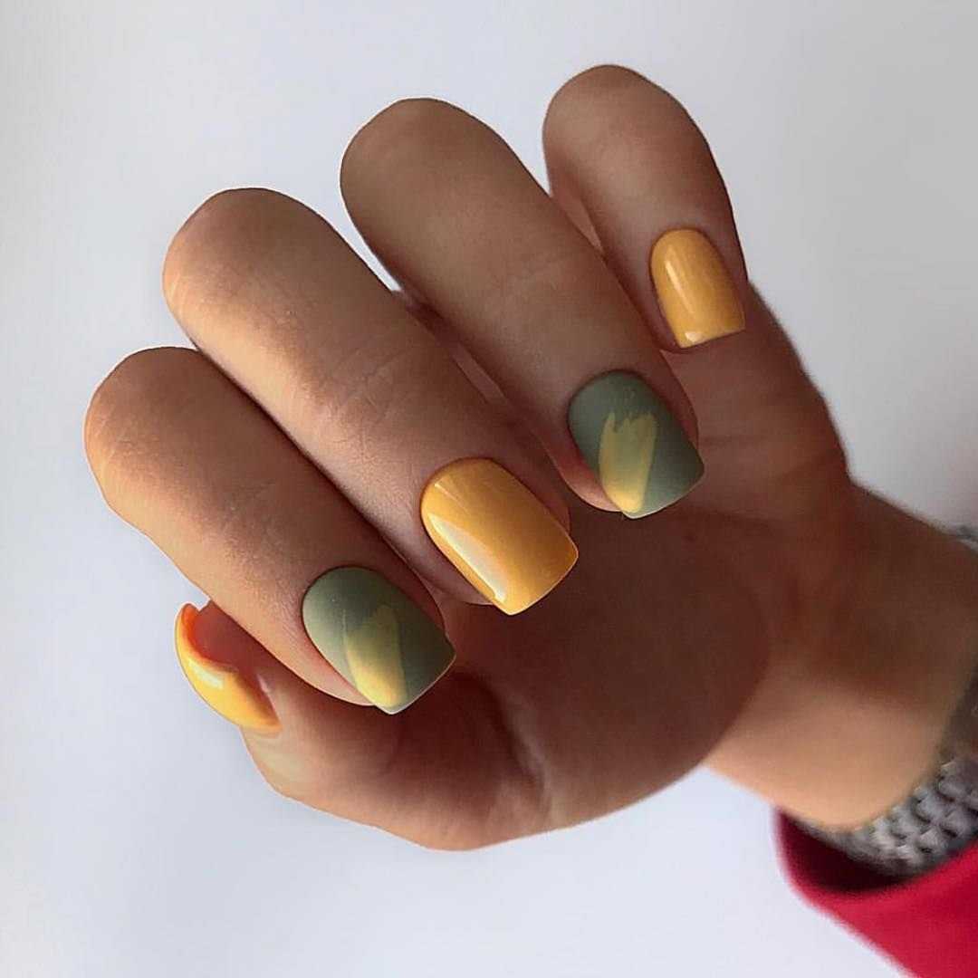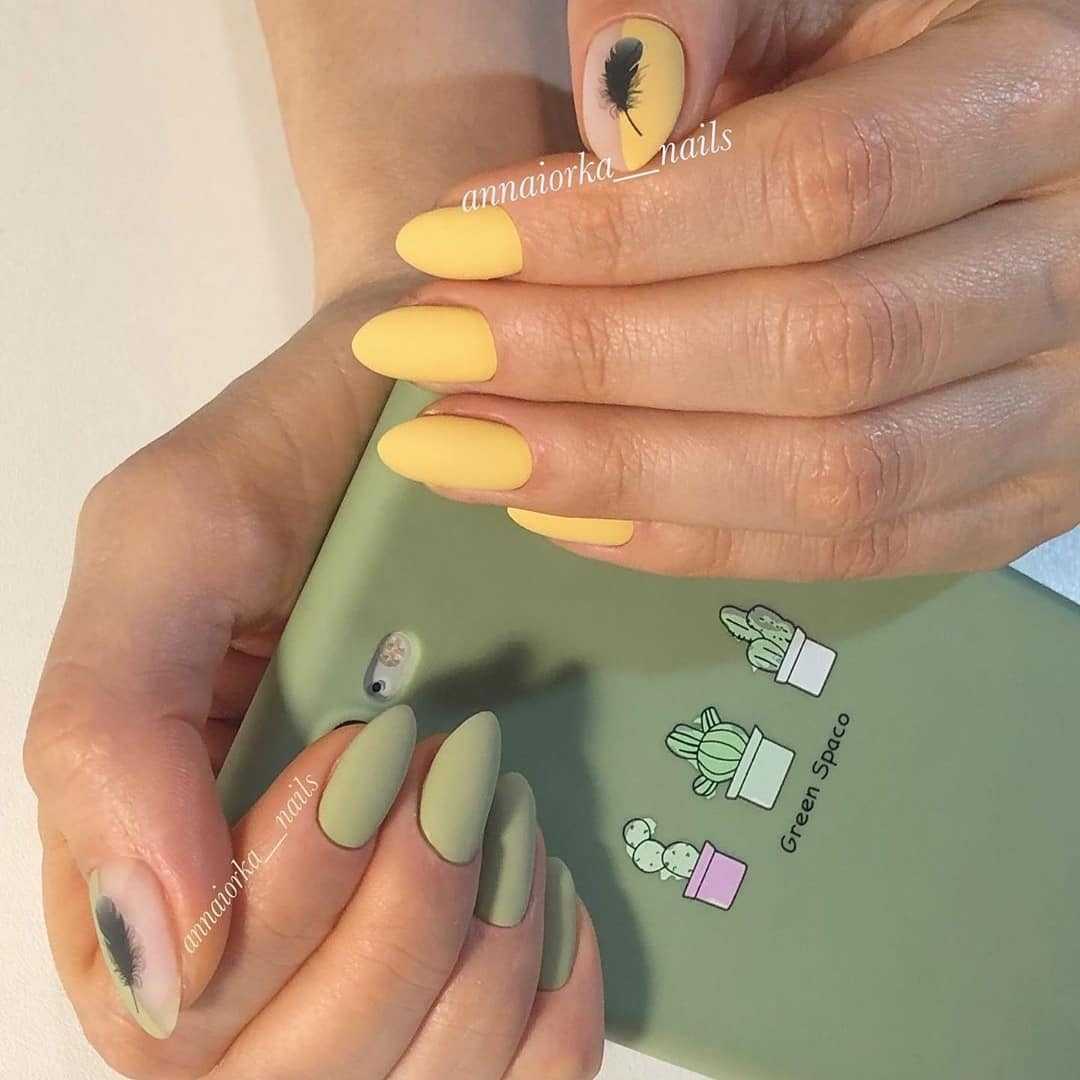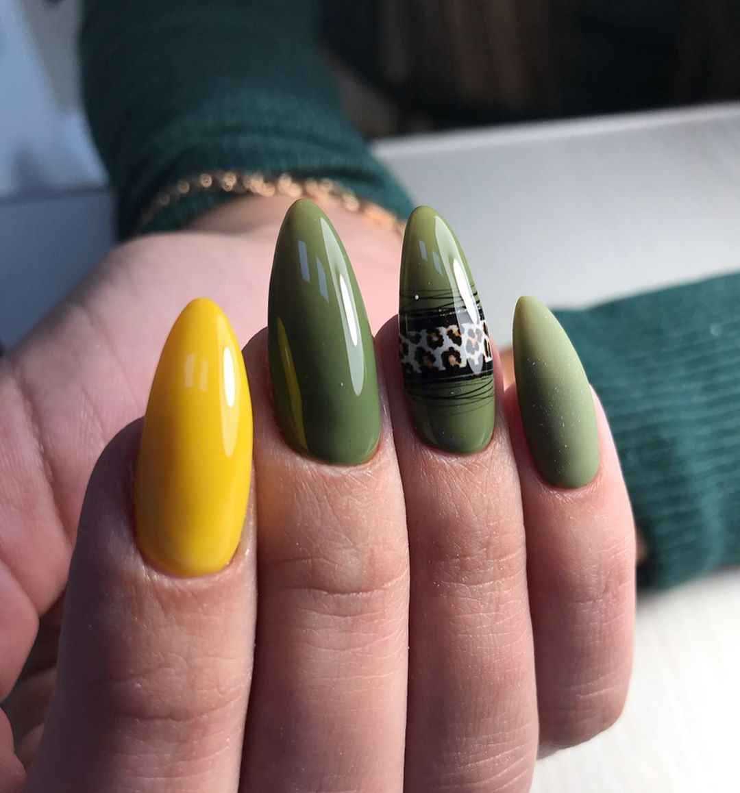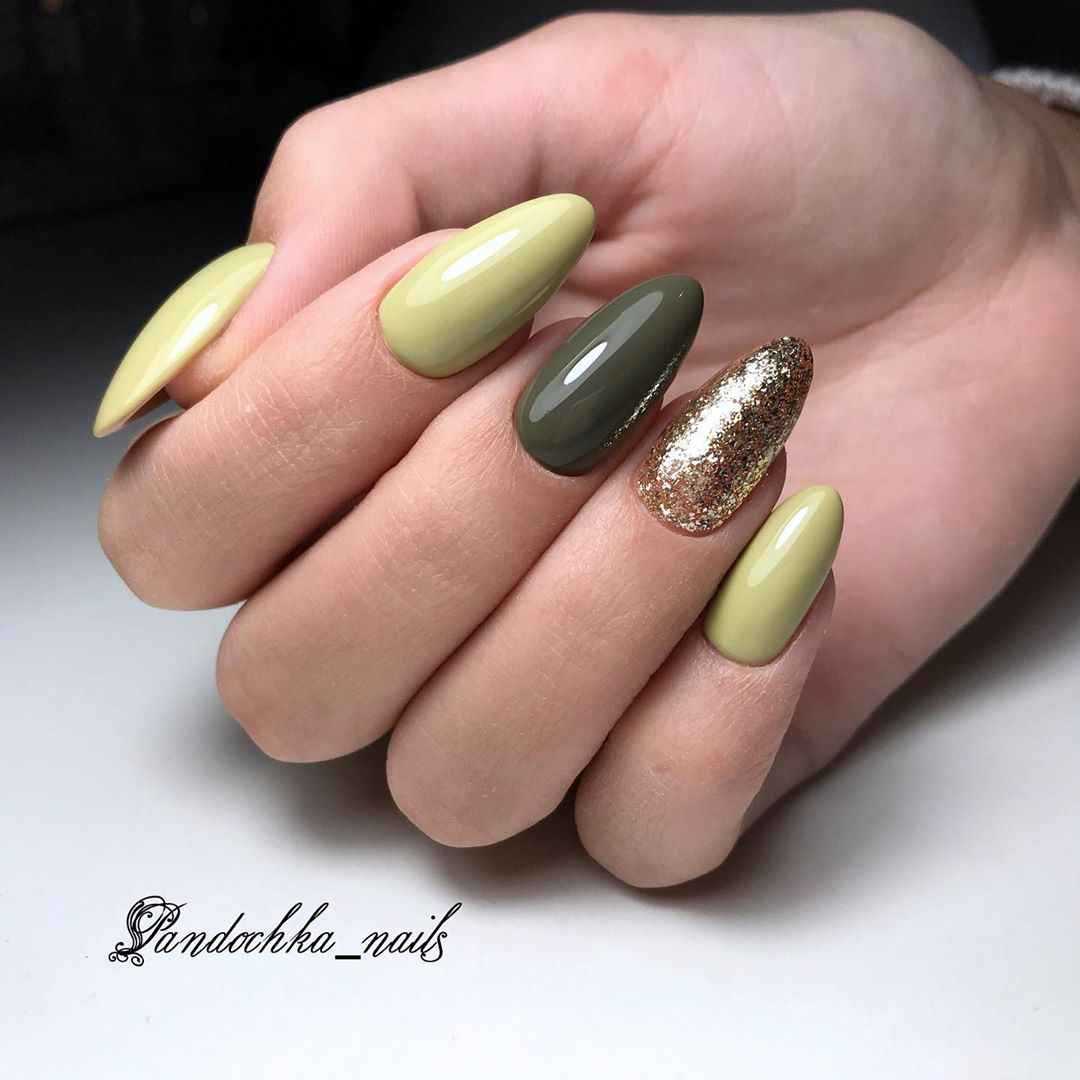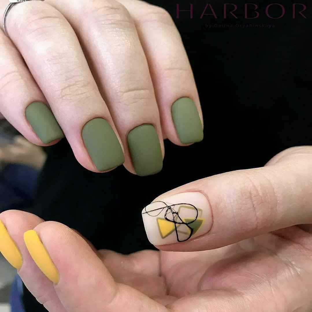 Желтый назван самым трендовым цветом этого года, поэтому его комбинации с хаки станут модной деталью образа. Помимо рисунков подойдет покрытие омбре или градиент, переходящий от желтого к оливковому сверху вниз. Привлекательно смотрится с разноцветными ногтями – в данном случае с желтым и вариациями приглушенного зеленого.