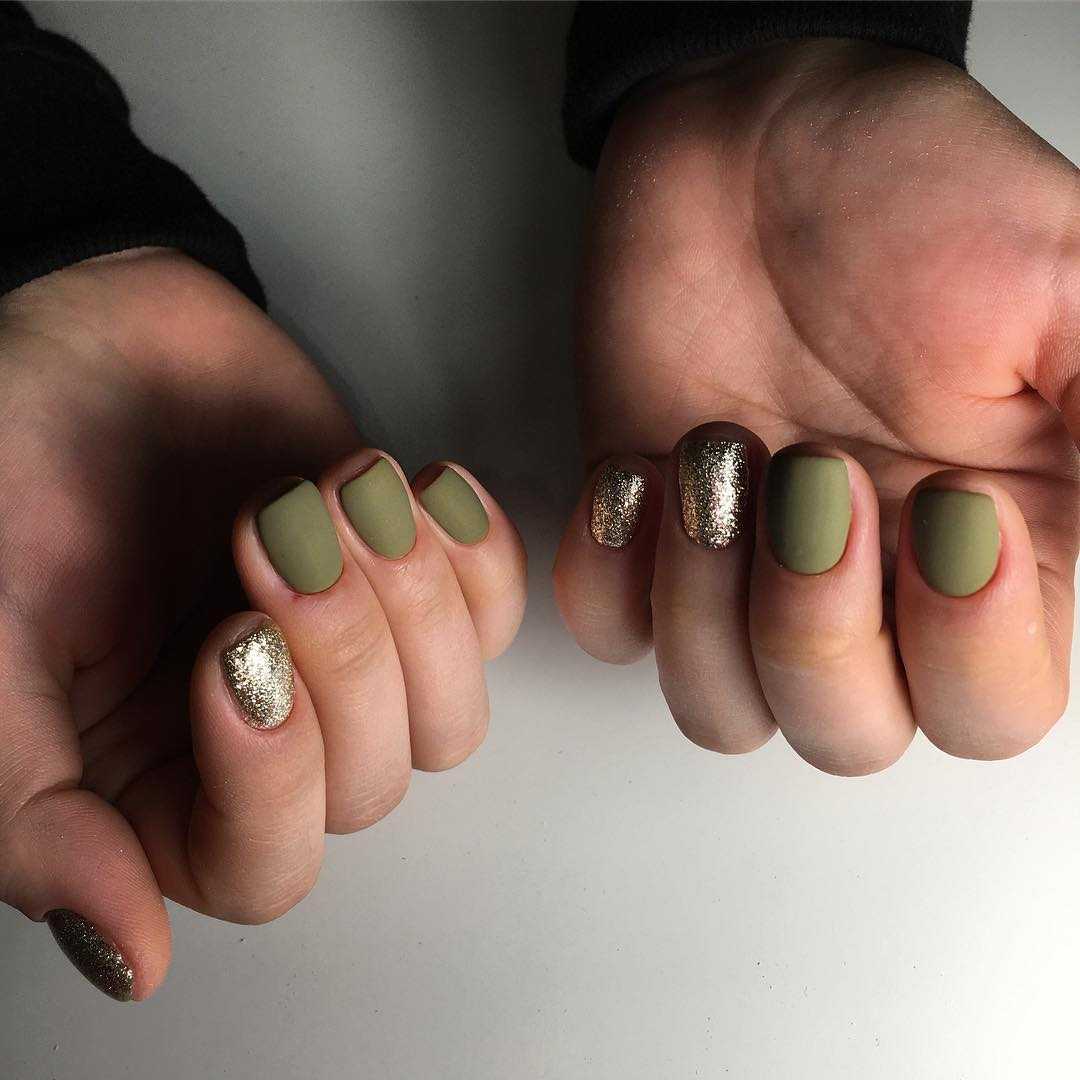 Каждый из этих вариантов имеет свои плюсы и уникальные особенности, но это не мешает комбинировать сразу нескольких видов. Такой подход обязательно оживит ноготки удивительной игрой на контрасте и позволит избежать повторений. Довольно популярным считается матовый маникюр хаки, который можно комбинировать с глянцевыми поверхностями ноготков. Кроме того, интересно смотрятся фактурные покрытия, зачастую в виде велюра, бархата, замши и сатина.