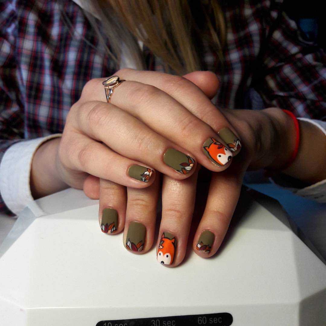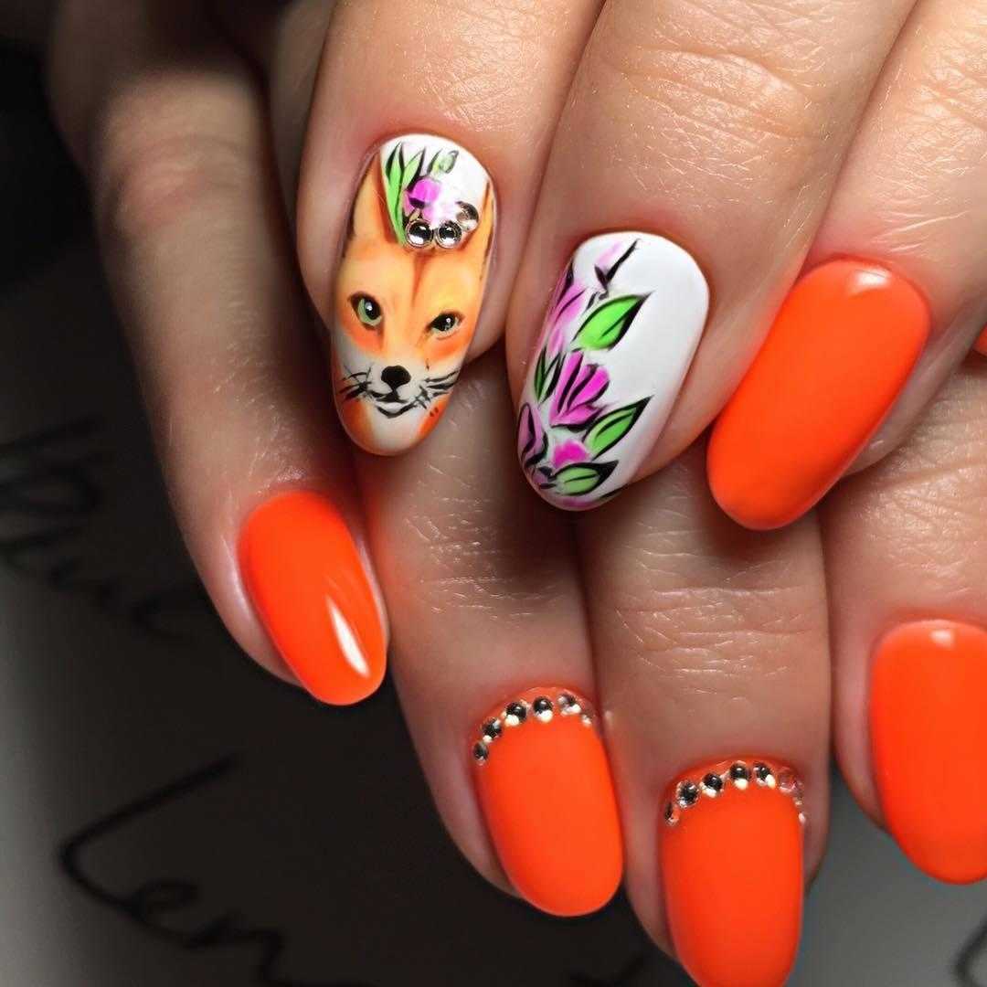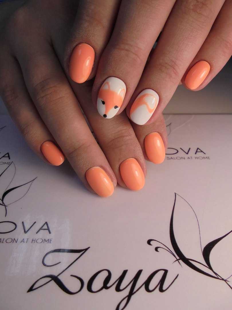 Дизайн оранжевого маникюра 2020: лисичка и другие животные