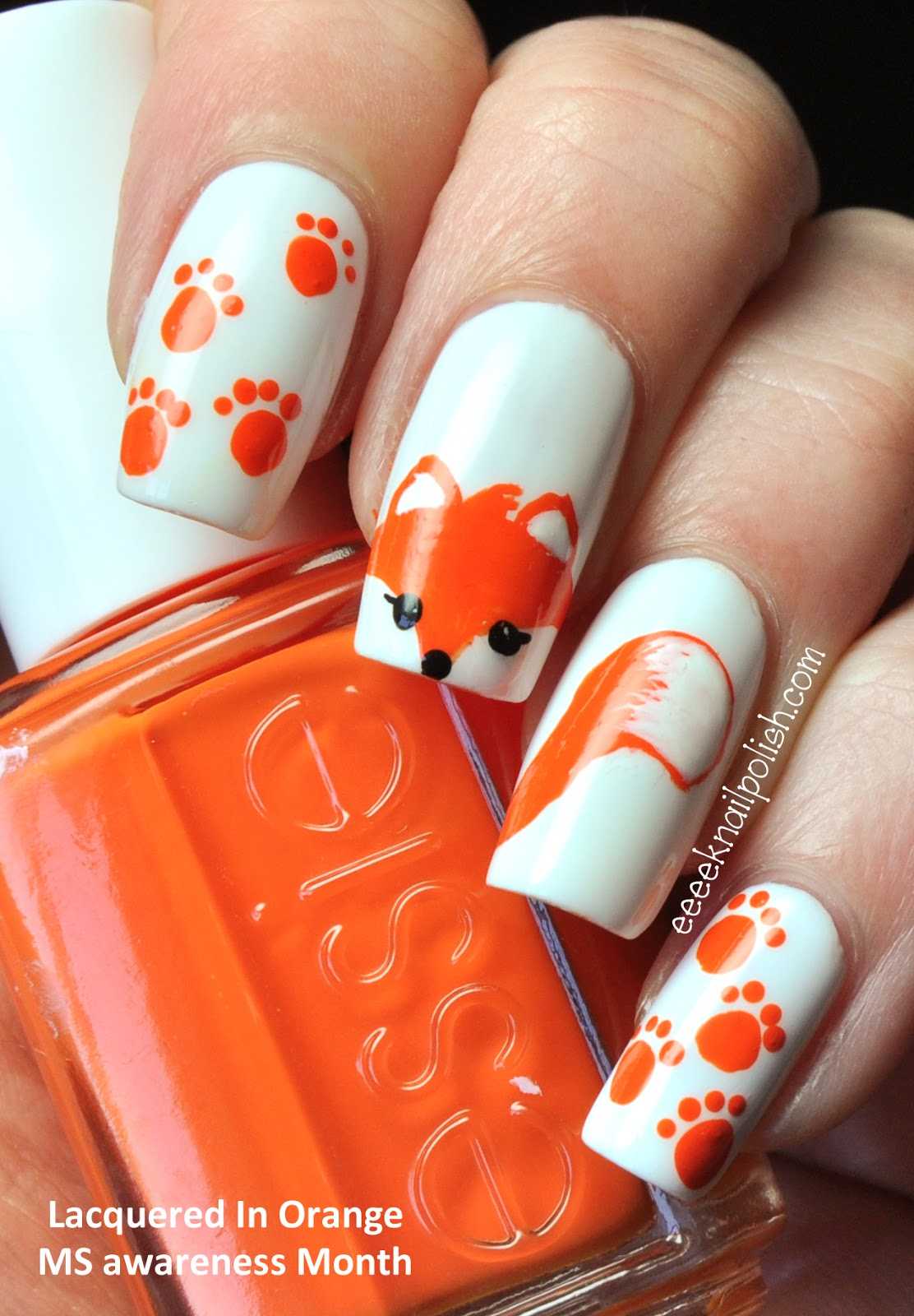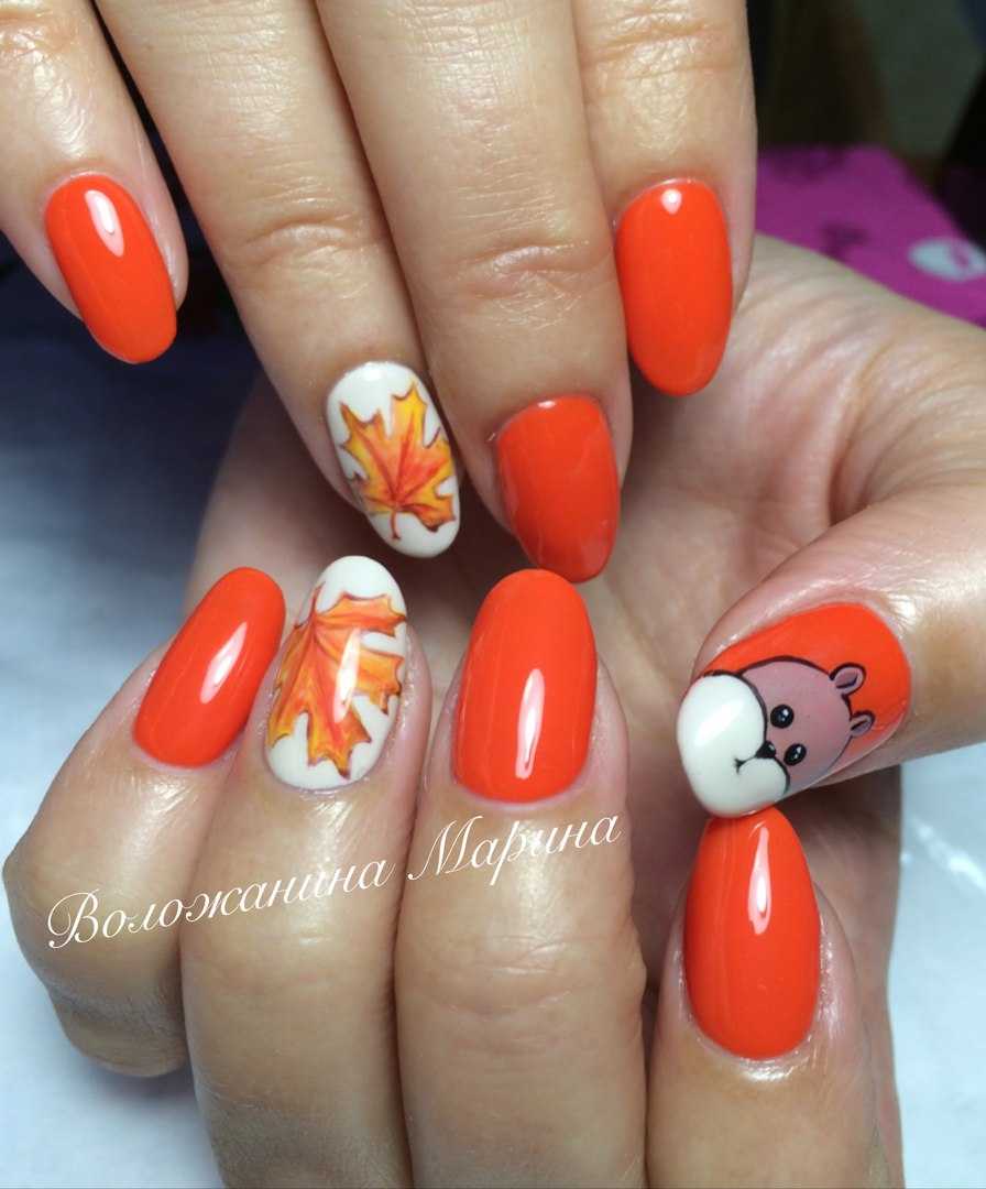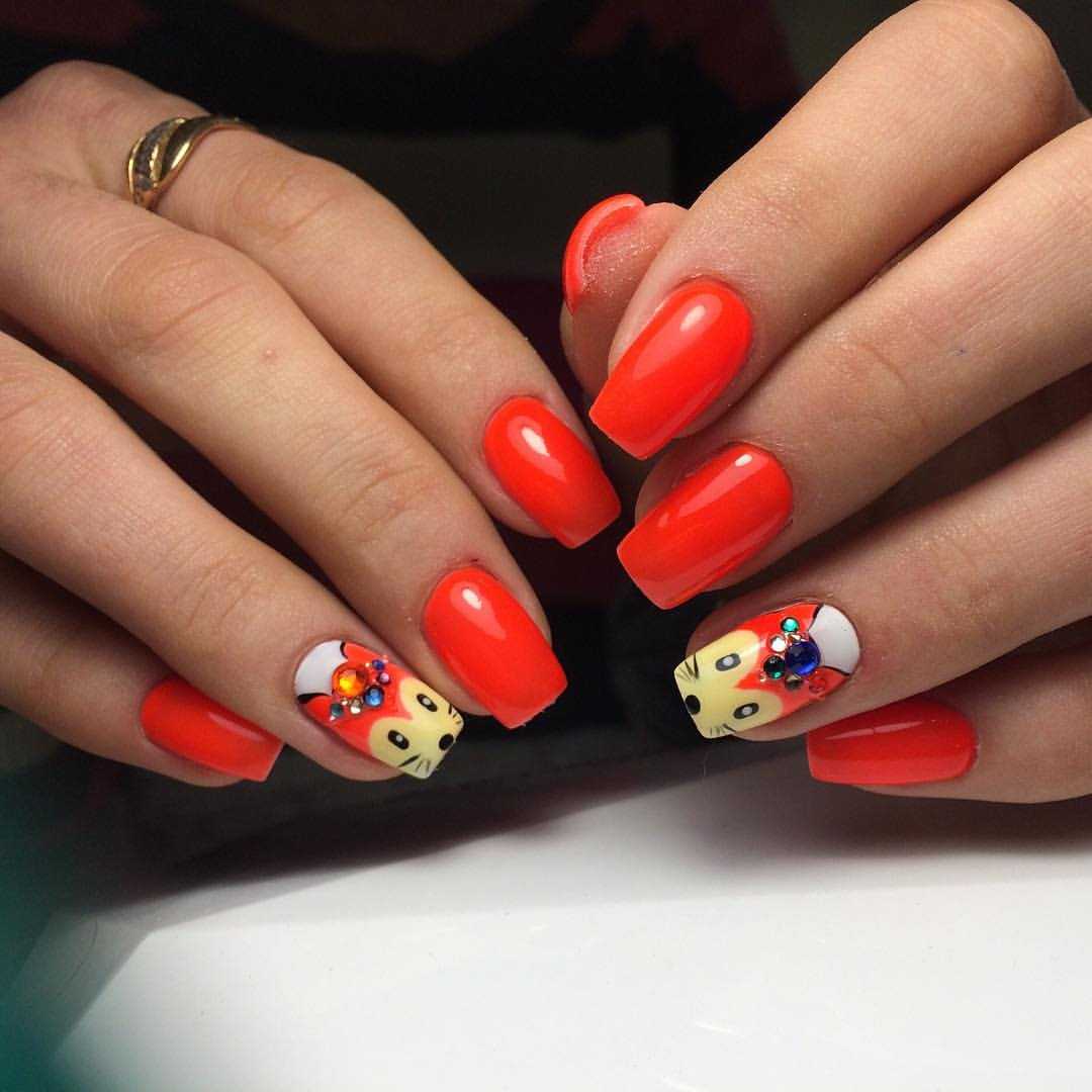 Дизайн оранжевого маникюра 2020: лисичка и другие животные