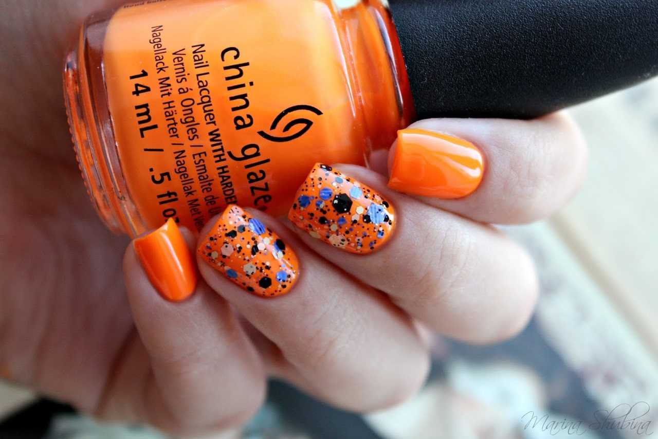 Дополнительное сияние оранжевому придадут блестки, которые наносятся на площадь ногтя полностью, на область лунулы или внешний край. С ярким цветом хорошо смотрятся блестки в тон, а также выполненные золотым или серебряным лаками.