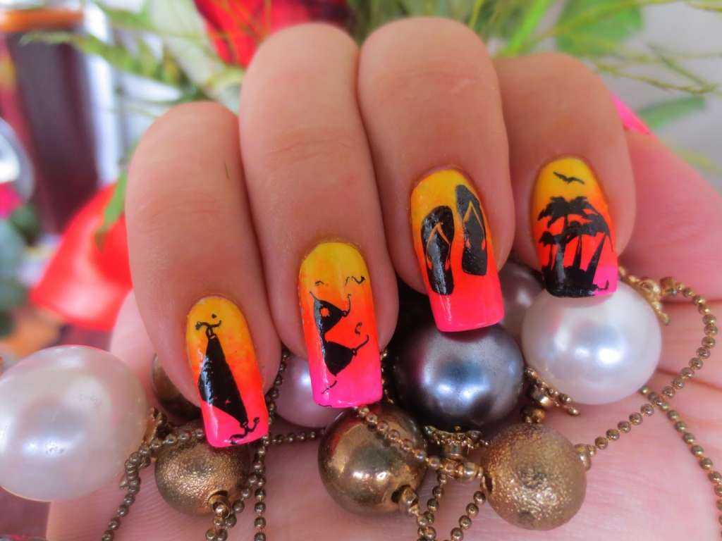 Если речь идет об узорах заката, лучшим дополнением к такому нейл-арту станут пальмы, берег моря и другие атрибуты пляжного отдыха. На помощь приходит черный цвет, который, как мы уже говорили, делает дизайн более насыщенным и ярким.
