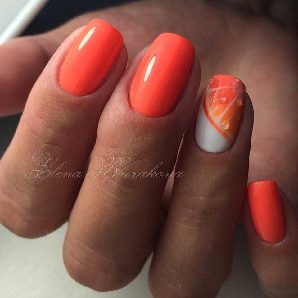 - Ярко-оранжевый. Такой маникюр — идеальный вариант для лета. Он яркий, сочный и по-настоящему летний. Кроме того, в данном оттенке можно воплотить множество интересных задумок касаемо дизайна.