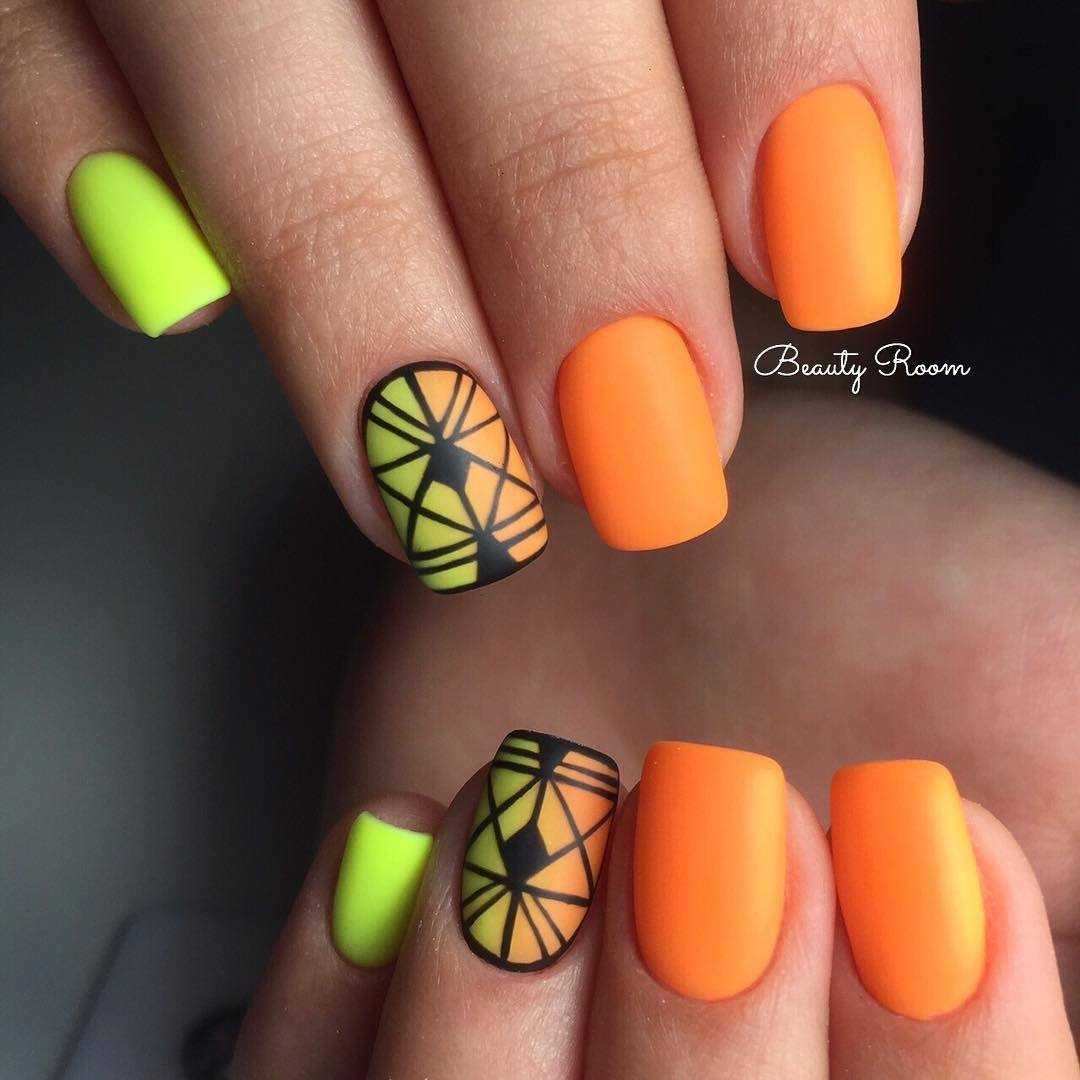 Для экстравагантных узоров, рисунков, принтов и прочих экспериментов идеально подойдёт сочетание оранжевого с чёрным. Это идеальный вариант для творческих натур. Такое цветовое сочетание можно использовать для создания модных узоров: геометрических, анималистических, абстрактных. Особенно уместен такой контраст на маникюре к Хэллоуину.
