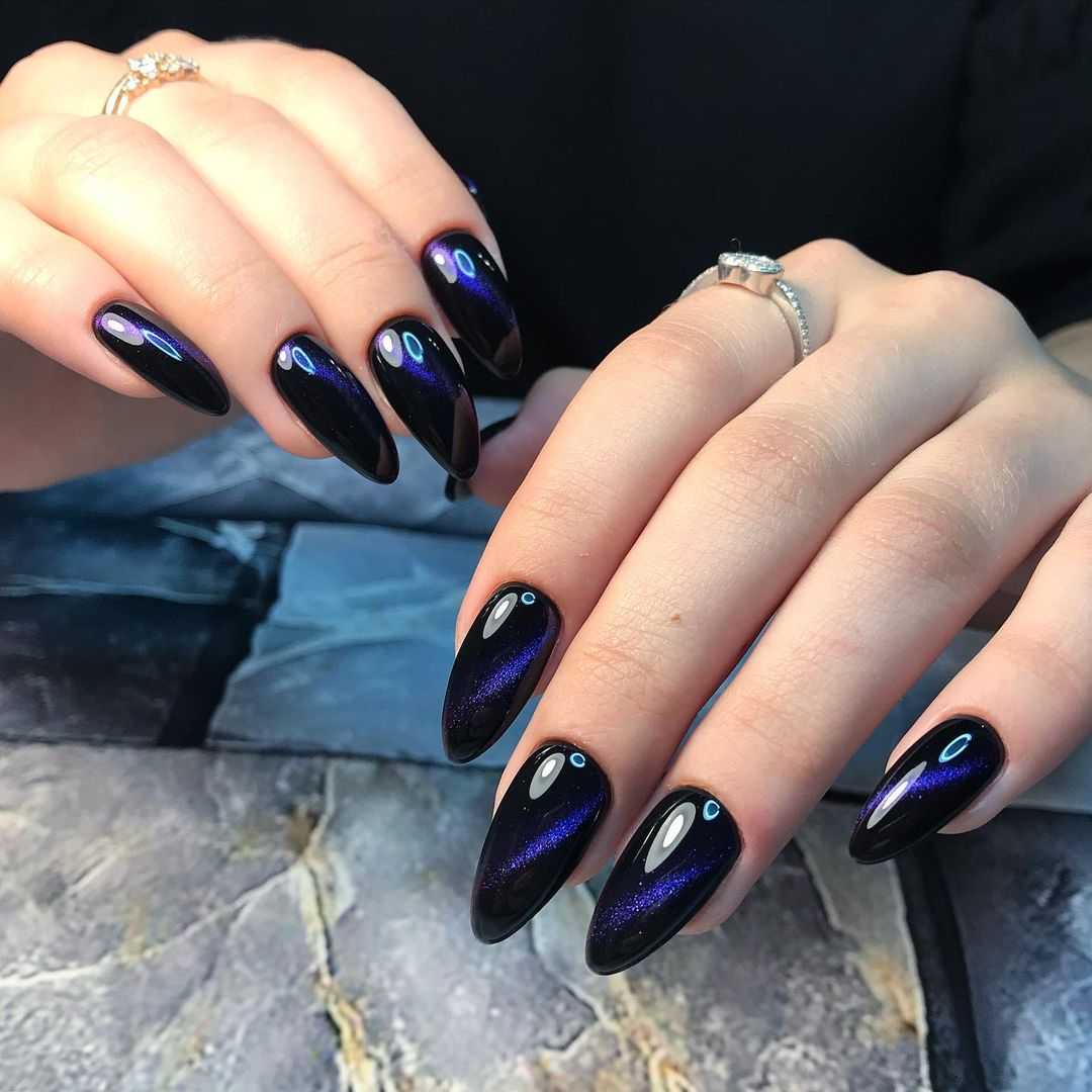 Черный лак — еще один тренд маникюра осени—зимы 2022—2023. Черный лак в моде и как однотонное покрытие, и в комбинации, как «инь и янь», например, а также и черный лак, напоминающий звездное небо.