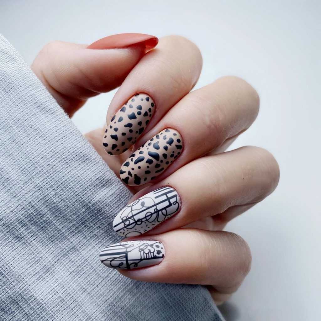 Это очень смелый дизайн. Главное правило: основа должна быть нюдовая. Так ногти не будут выглядеть вульгарно. Светло-розовая основа с добавлением золота и леопардового принта – хит осеннего сезона.