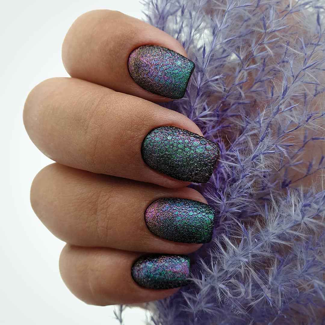 Наиболее эффектно такие дизайны смотрятся на средних и длинных ногтях. Короткая ногтевая пластина не позволяет отразить все переливы и красоту полученного результата. Похожую фактуру можно создать с использованием гель-лака кошачий глаз различных оттенков. Его наносят на черную основу и, используя магниты, формируют блик. Для придания пузырькового узора поверхность покрывают прозрачным топом без липкости.