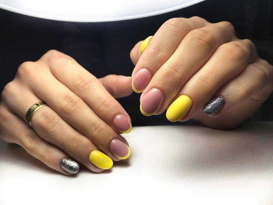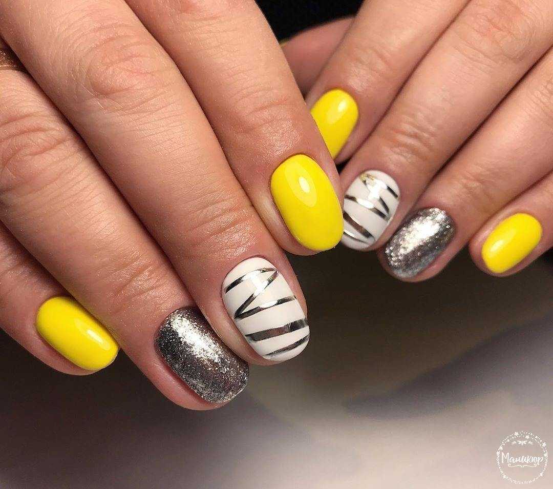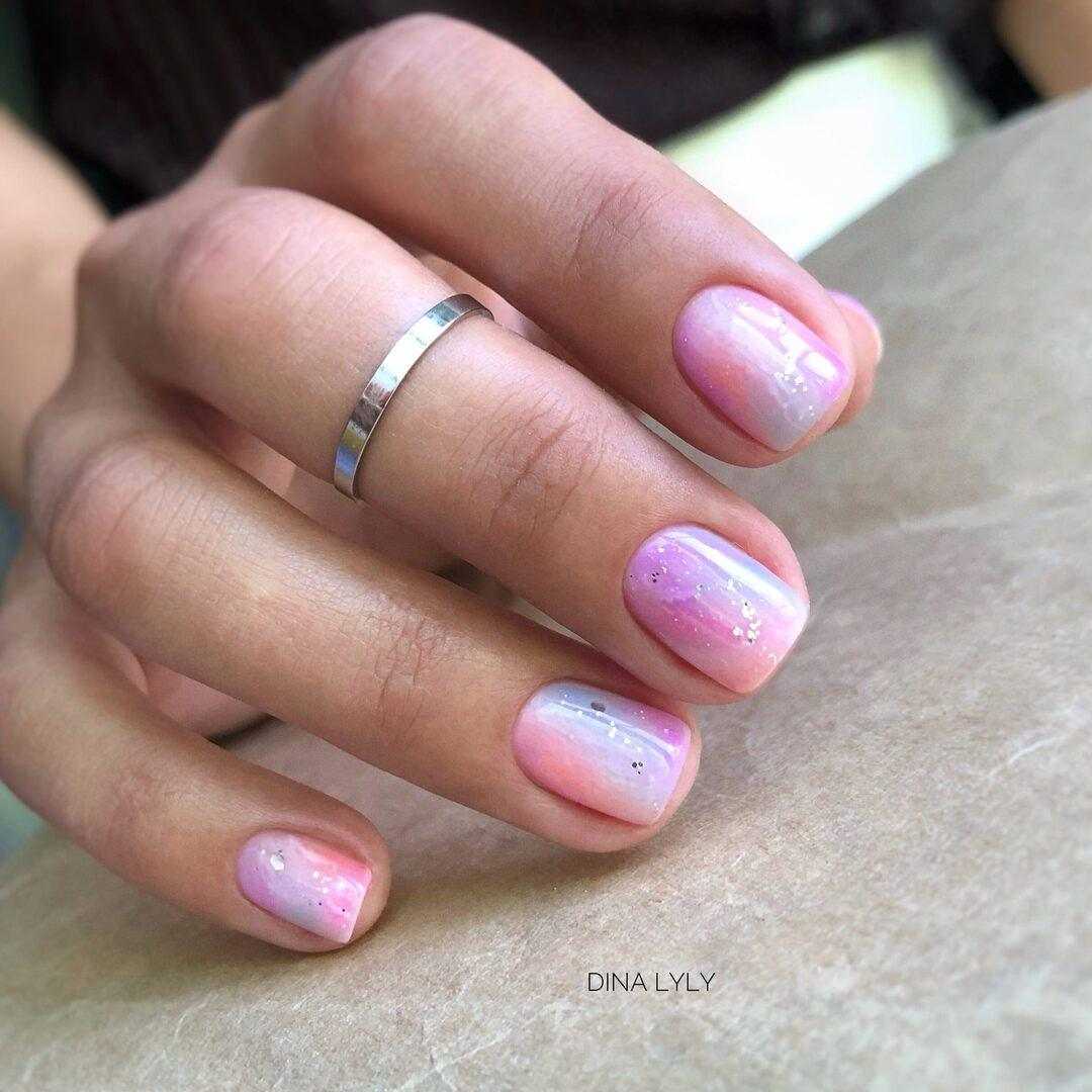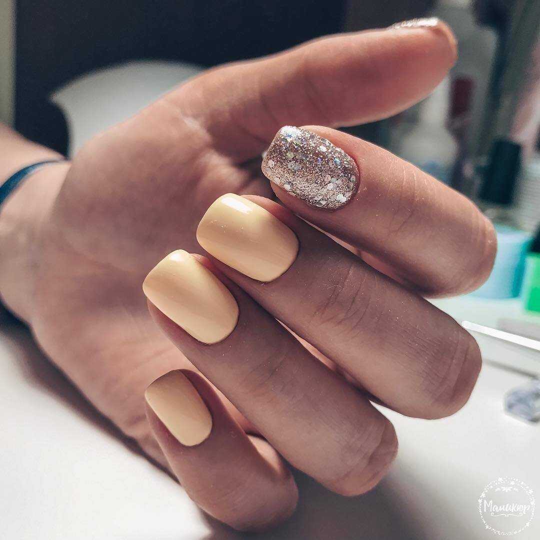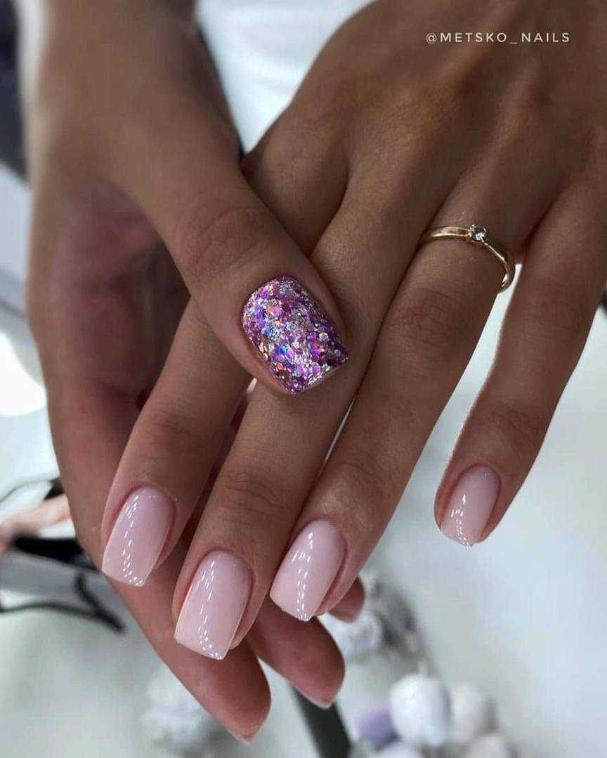 Для создания стильного маникюра на коротких ногтевых пластинах лучше отказаться от неоновых или кислотных оттенков и отдать предпочтение более мягким цветам, которые в дуэте с блёстками позволят ноготкам выглядеть не только красиво, но и более естественно. Продольные полоски с дублированием в виде глиттера, однотонный дизайн с блестящей растяжкой на акцентном ноготке, несложные узоры из пайеток, кусочки фольги в качестве подложки под рисунок на безымянном пальце и многие другие идеи маникюра в минималистичном исполнении – лишь некоторые из возможных вариаций.