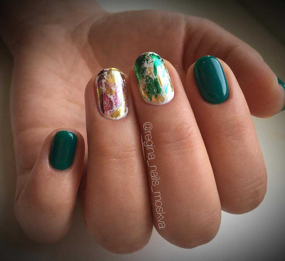 Фольгу следует нанести на покрытие, а уже потом использовать дизайнерскую паутинку. Изящно смотрится такая комбинация, дополненная стразами или блестками. Такой маникюр можно назвать новогодним, так как он действительно создает праздничное настроение. Удивительно, что простота исполнения не портит результат: дизайн смотрится дополнено и завершено.