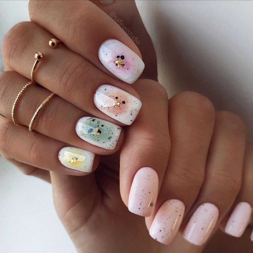 - Попробуйте нанести камифубики только на прозрачную основу. Маникюр будет легким и нежным.