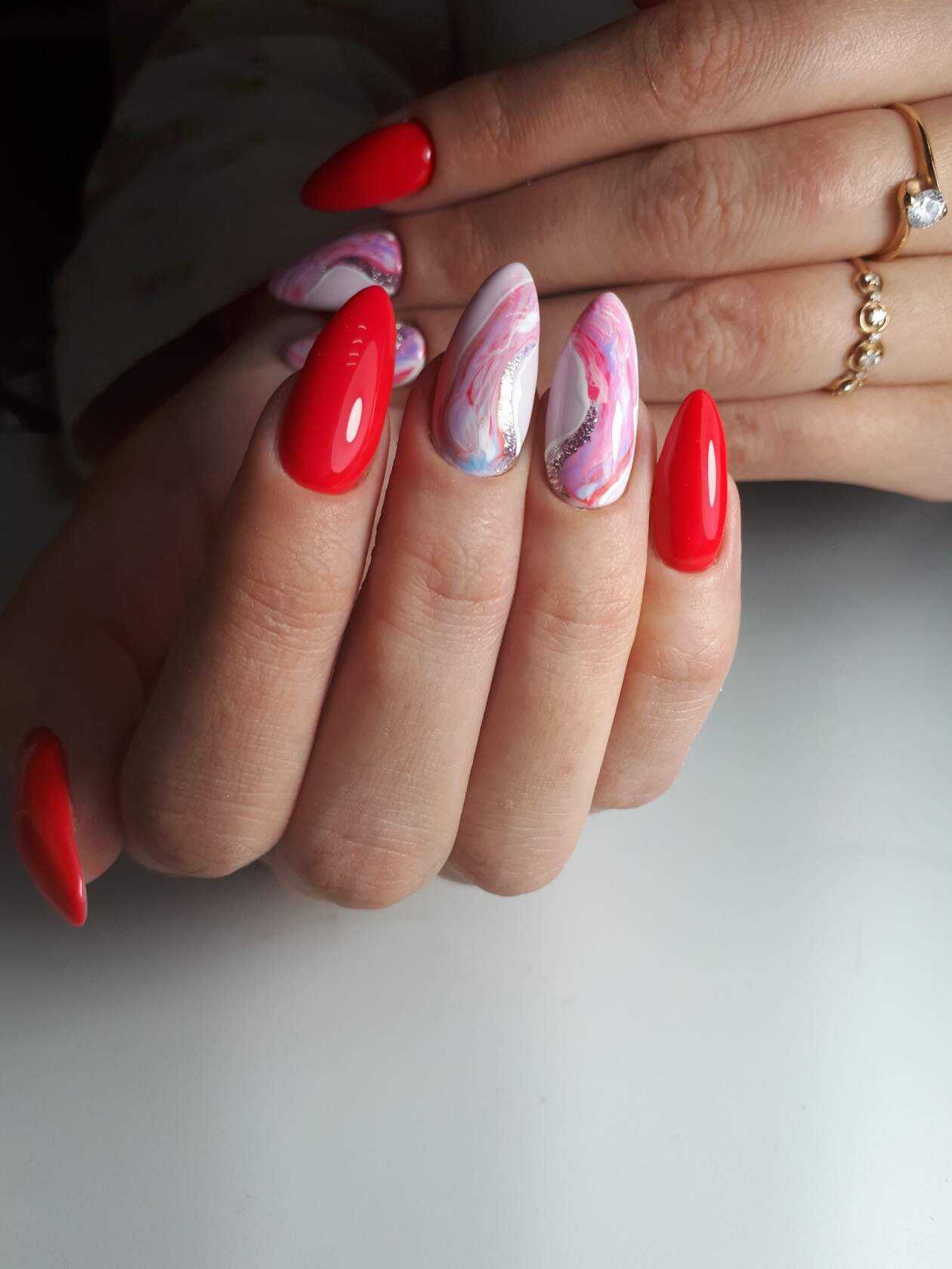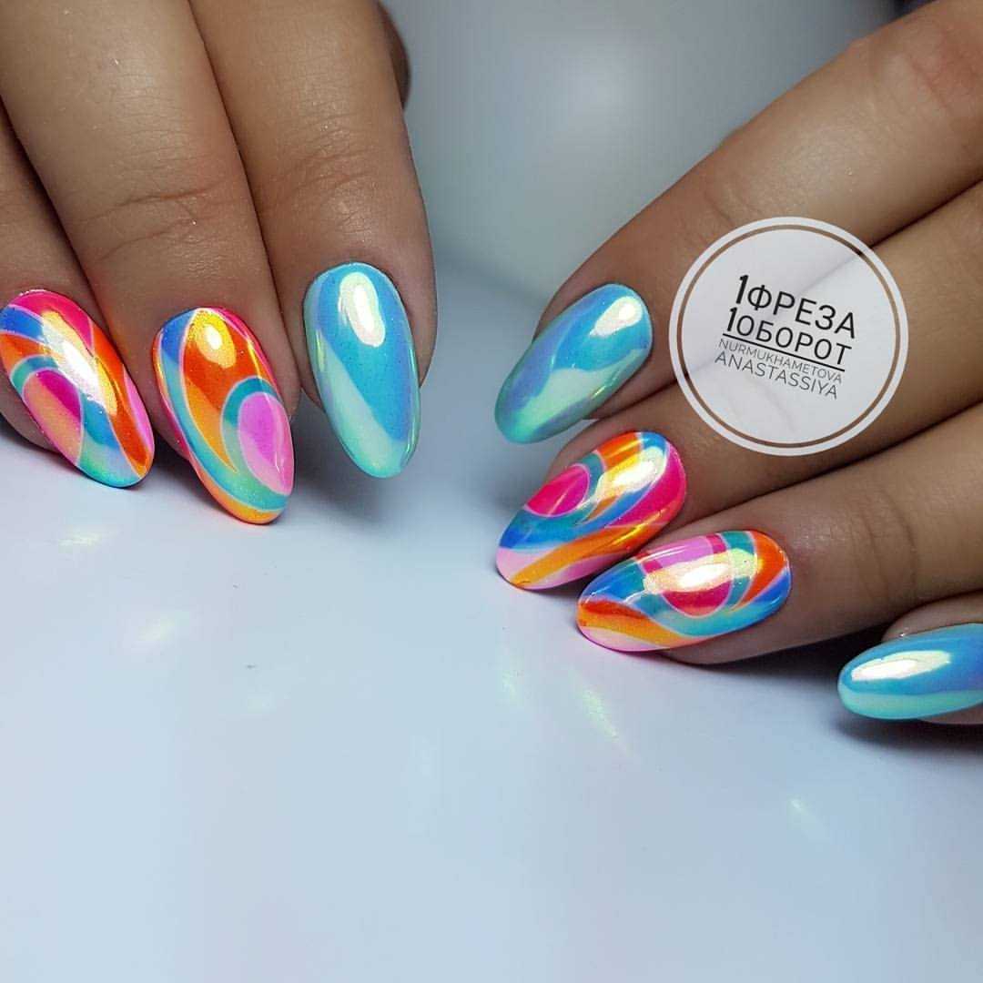 Цветовой микс привлечет внимание окружающих и будет радовать хозяйку веселым настроем. На одном ногте следует размещать цвета, которые сочетаются между собой: так мастер не нарушит гармонии и не испортит результат