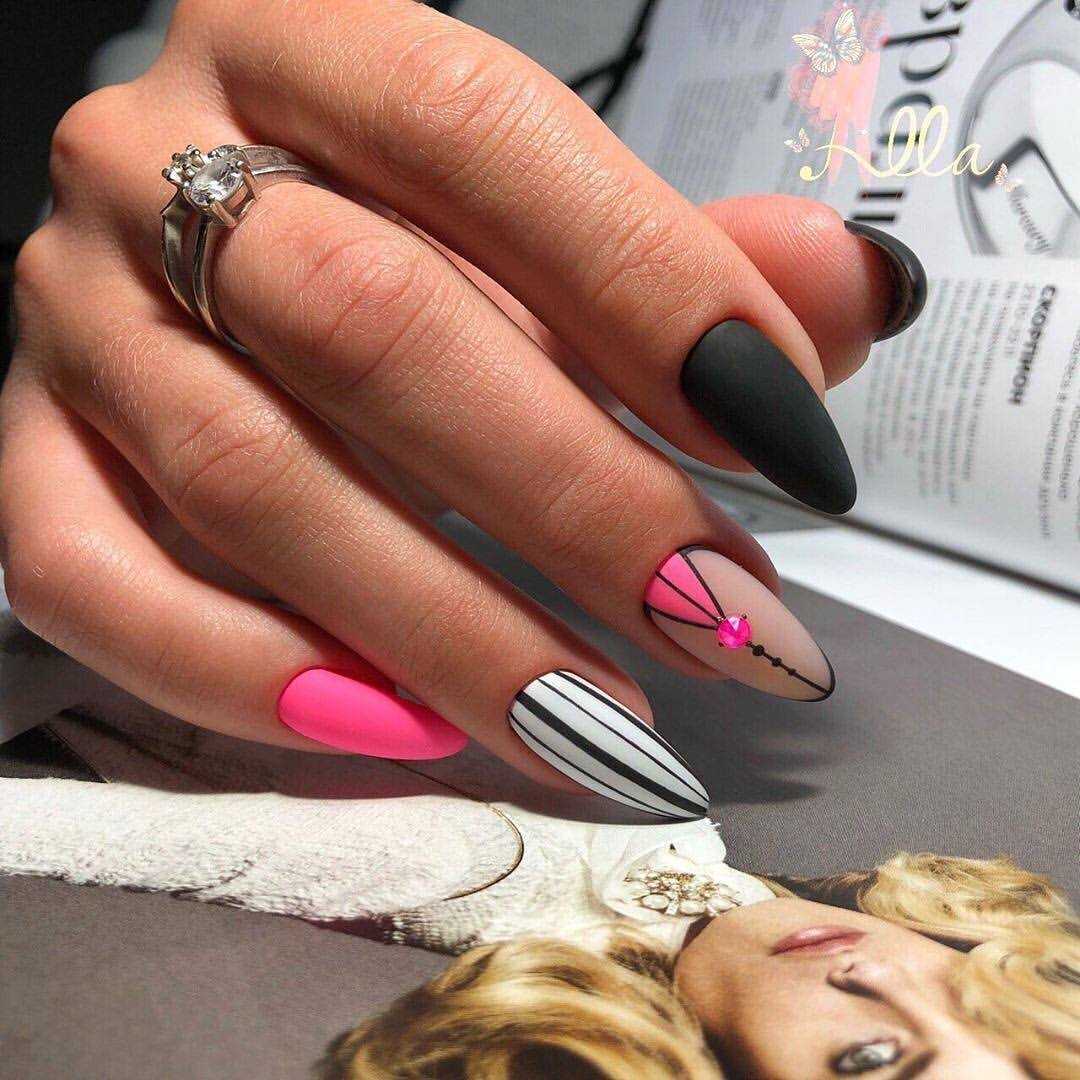 Посередине пластины можно поставить кляксу, а затем мастера начинают вытягивать из нее прямые геометрические линии. Если на месте кляксы остается некрасивая точка, ее можно скрыть под изящной стразинкой. Можно нарисовать совершенно разные фигуры, но главное не переборщить. Минимализм всегда остается в моде: пара линий выглядят лучше, чем параллелограмм на ногтевой пластине.