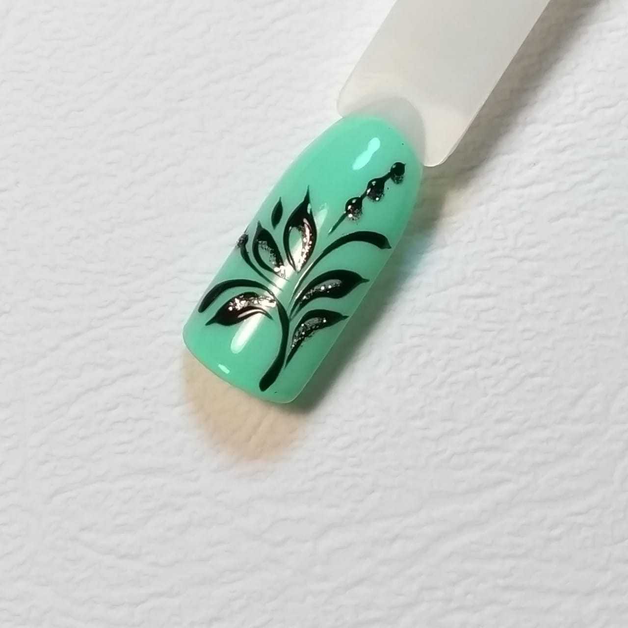 Шаг 6 – Для красоты можно продублировать некоторые элементы блестками. Если вы рисовали гель-краской без липкого слоя, то ваш дизайн на этом этапе готов. Если же вы рисовали вензеля гель-лаком, то после прорисовки нужно перекрыть дизайн глянцевым топом, чтобы зафиксировать получившийся рисунок.