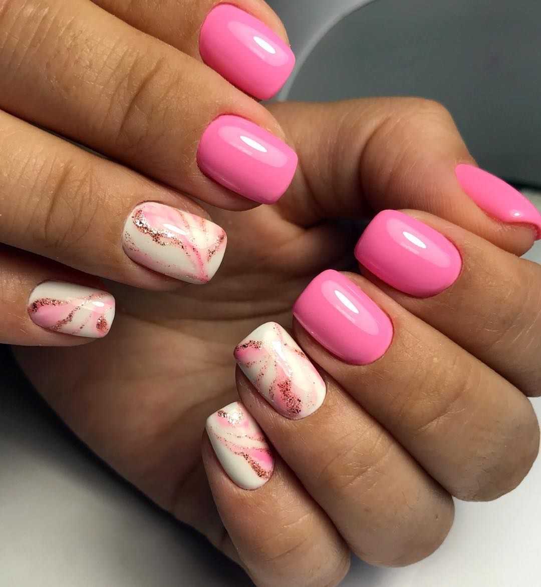 Среди сдержанных, лаконичных дизайнов все большую популярность приобретает мрамор. Это тонкая, едва заметная линия, имитирующая текстуру натурального камня. Интересно, что такой узор можно выполнить в разных оттенках. Это означает, что в данном случае рекомендуется использовать розовый цвет в качестве базового. И только на нескольких ногтях используйте черный, белый или другие оттенки, которые вам идут. Нарисуйте линии тонкой кистью. Это позволит сделать его максимально похожим на мрамор.
