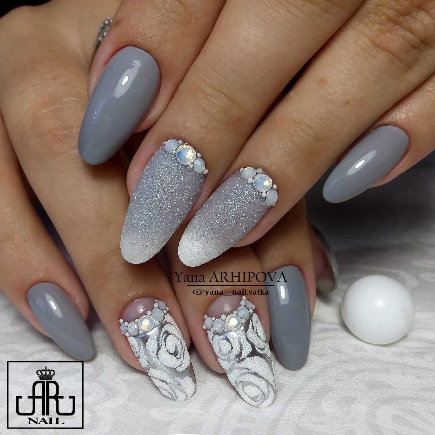 Серый маникюр для праздничных торжественных мероприятий должен быть ярким, поэтому украшения здесь только приветствуются. Рекомендуемый декор – блестки, стразы, поталь. Интересно будет смотреться сочетание с яркими цветами.