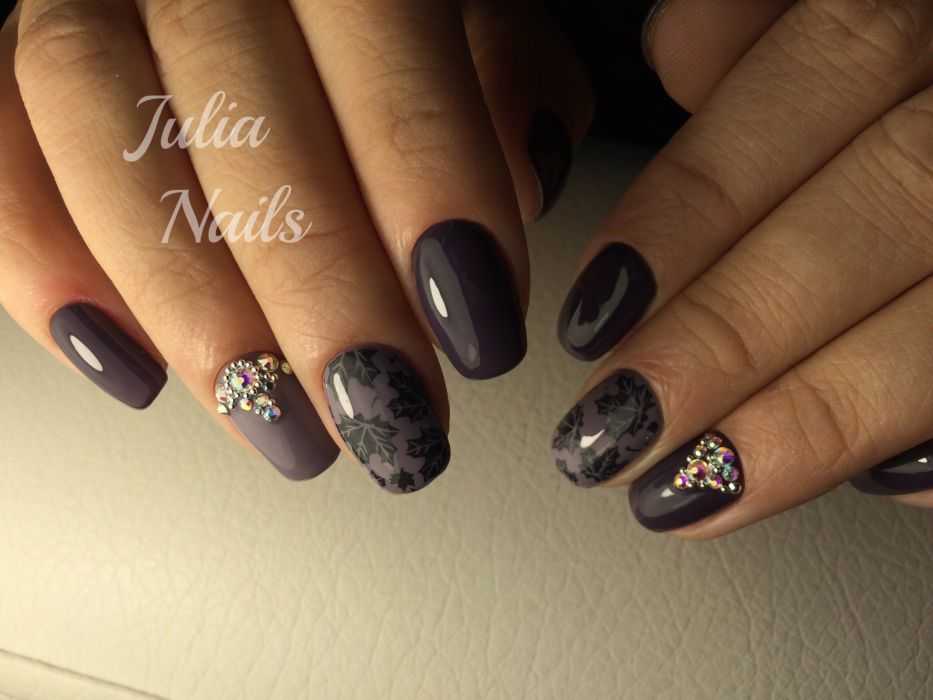 Для создания вечернего маникюра в серых тонах можно использовать матовый топ и поверх него нанести еле уловимый рисунок топом, витражным лаком либо черным шеллаком.