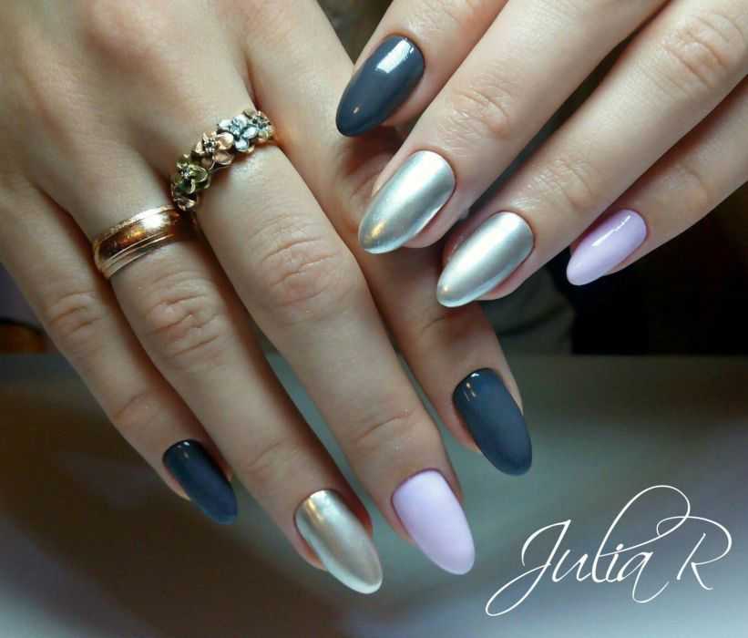 Акцент на фактуру ногтей приобрел популярность после появления гель-лаков с матовым эффектом. Комбинировать их с другими видами покрытия стали многие мастера. Не обошла эта тенденция сочетание серебра и серого.