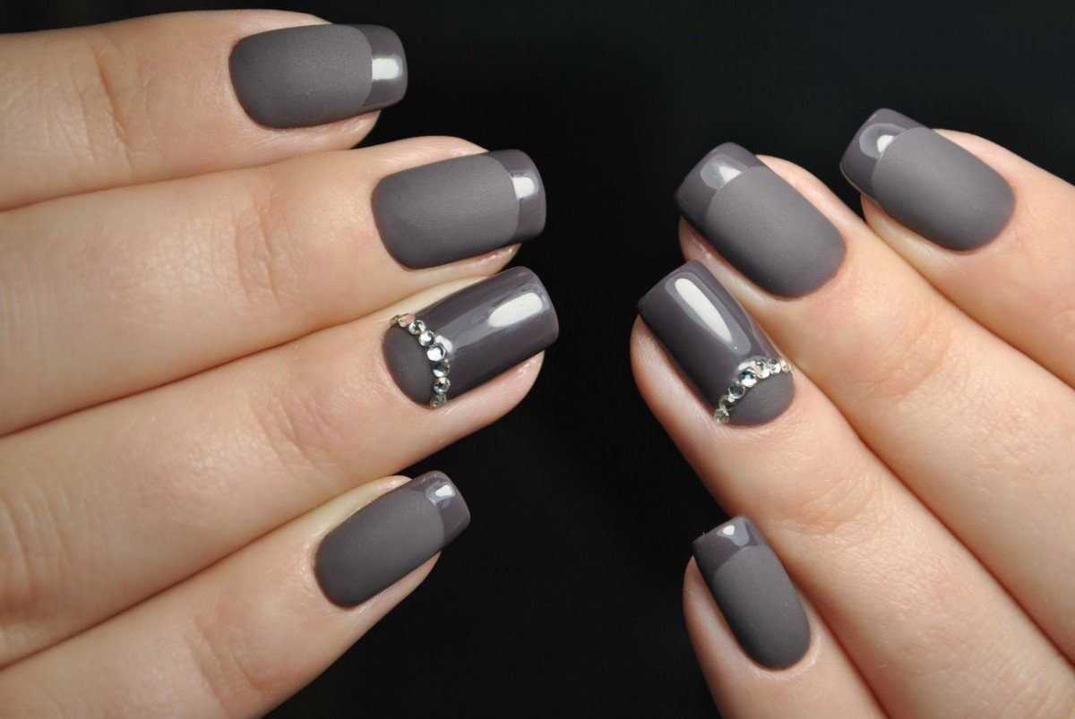 Не менее популярен и лунный маникюр. Отлично смотрится розовая улыбка у основания серого ногтя. Чтобы дизайн подходил и для торжественных случаев, добавляют стразы и блестки. Однако их количество должно быть умеренным, иначе маникюр кажется слишком вычурным.