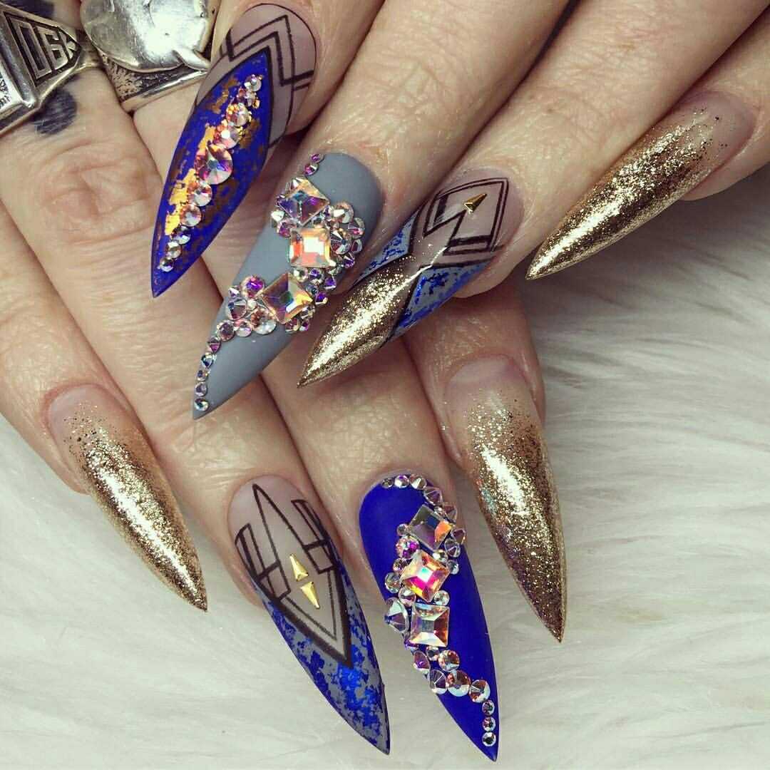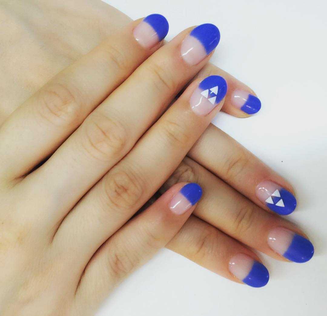 Очень оригинальным решением для синего дизайна станет смешивание цветов: синий и голубой, синий и золотой, синий и белый. При этом модницы делают не классическую тонкую улыбку, а наоборот, создают треугольные края, отстраняя свой маникюр к геометрическому стилю.