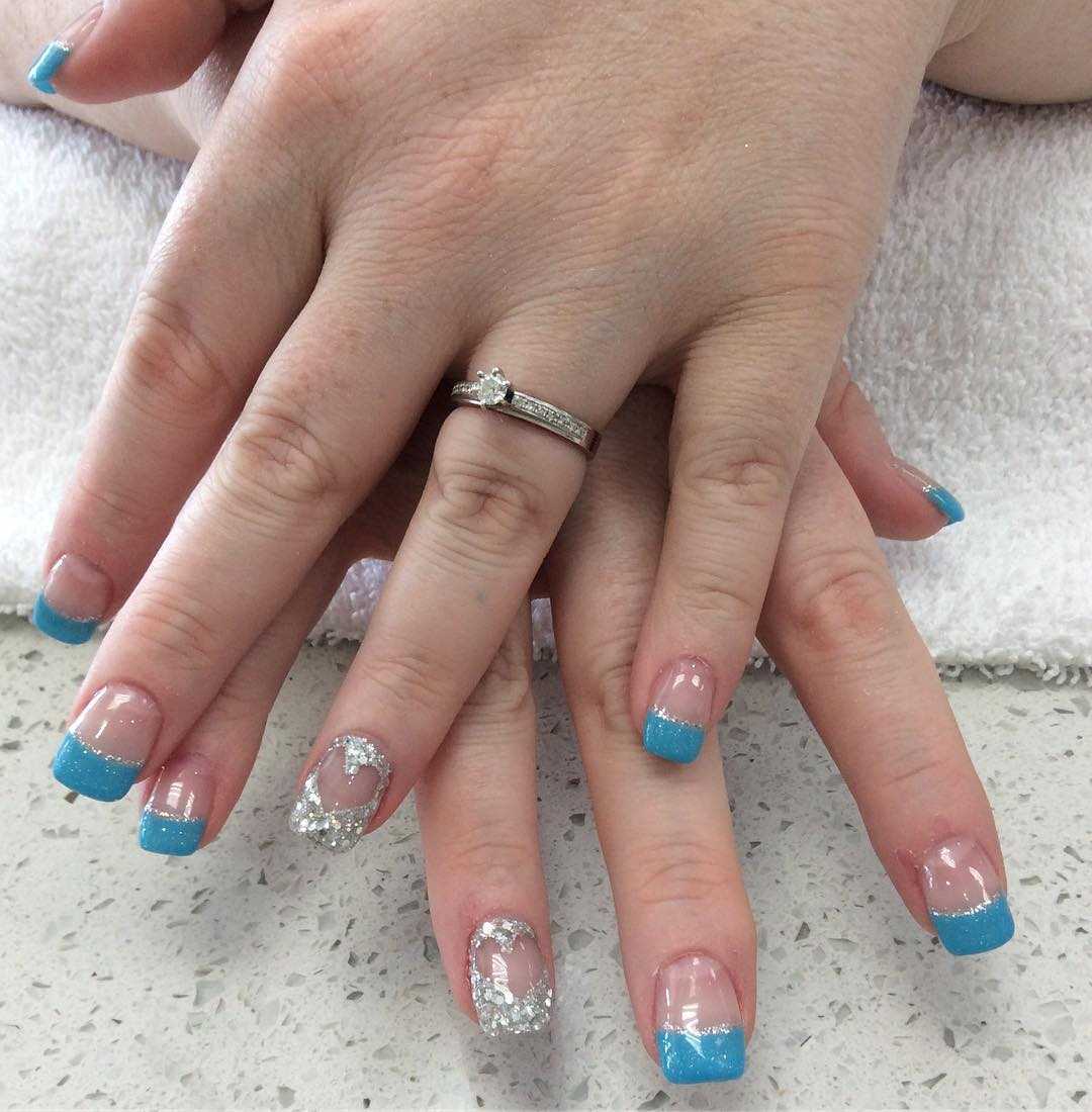 Для того чтобы придать синему френчу некую изюминку и особый вид, мастера нейл-дизайна предлагают использовать блестки и стразы. Стразы располагайте в прикорневой зоне. Использование большого количества страз в маникюре может сделать маникюр вульгарным и небрежным. Край ноготков в синем французском маникюре, как правило, украшают золотистыми или серебряными блестками. Не менее привлекательно будет смотреться использование в синем французском маникюре вместо камней камифубуков или бульонок. Красиво будет, если улыбку на безымянном пальчике выложить слоем камифубуков, бульонками же украсить весь акцентный ноготок.