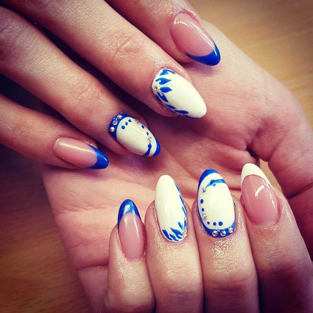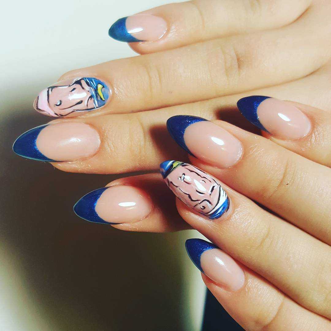 Если девушка решила сделать синий френч на длинных ногтях, она должна попросить мастера подобрать для пластин идеальную форму, которая соответствует длине пальцев и размеру кисти.