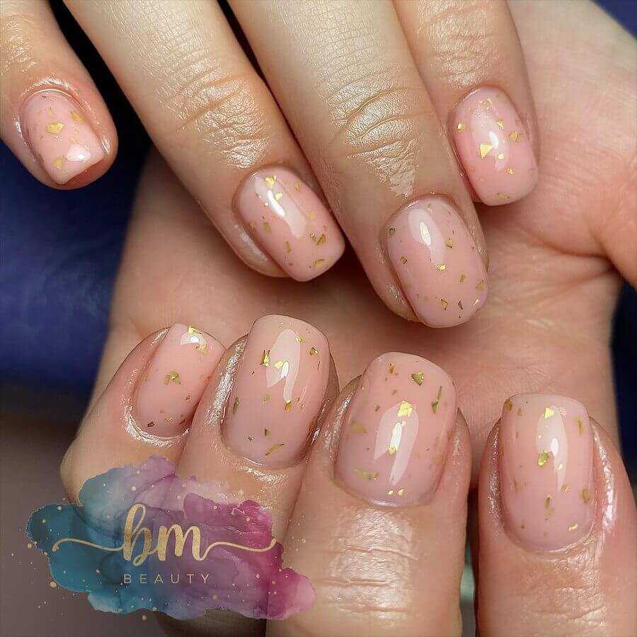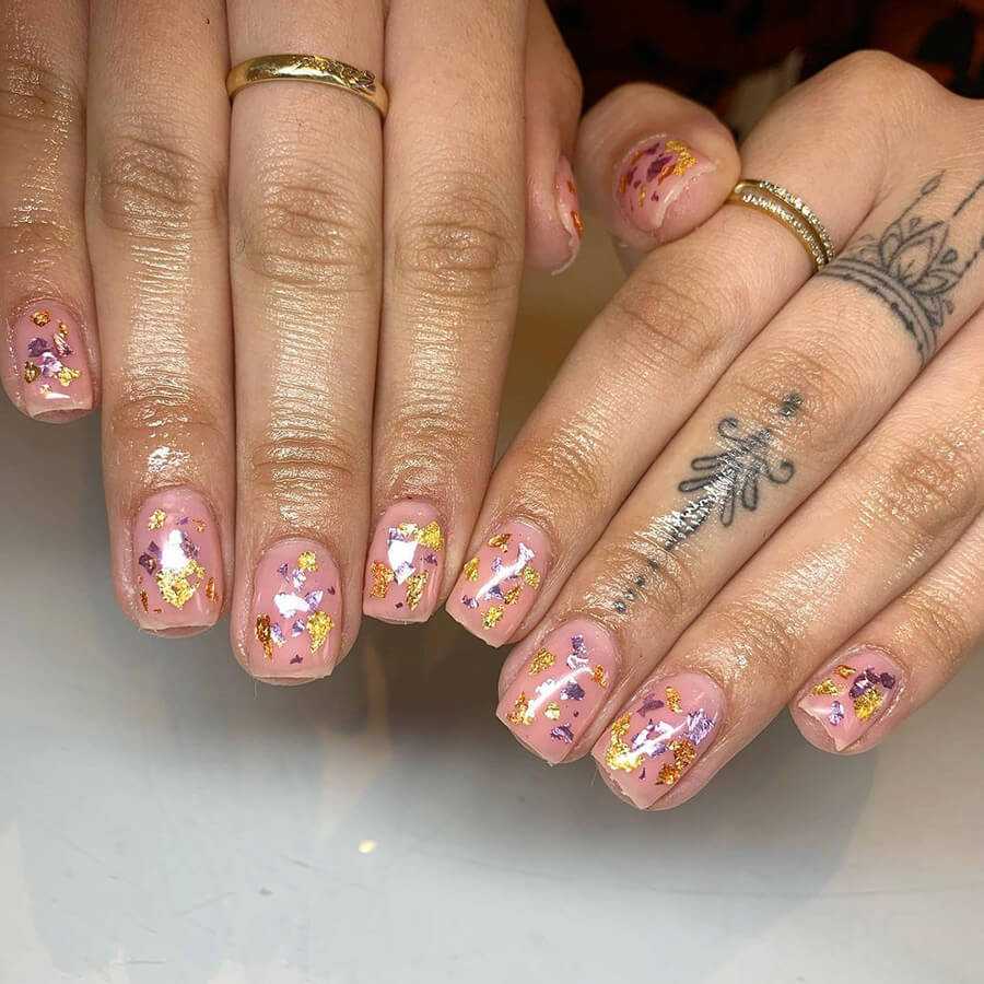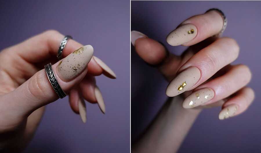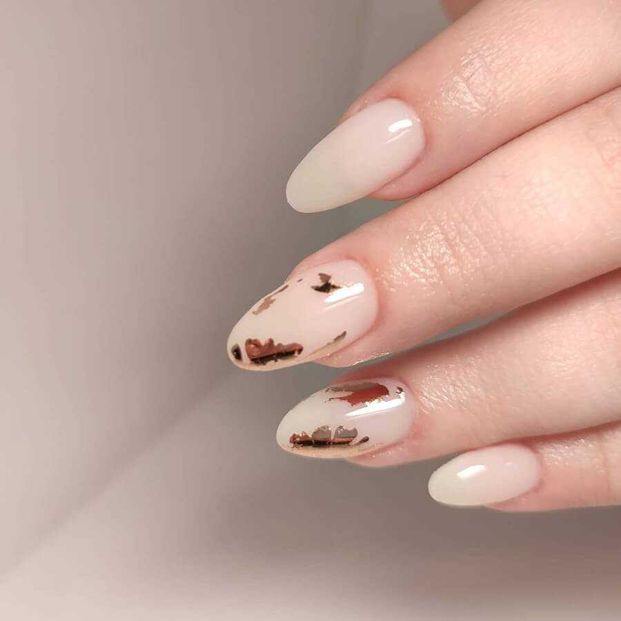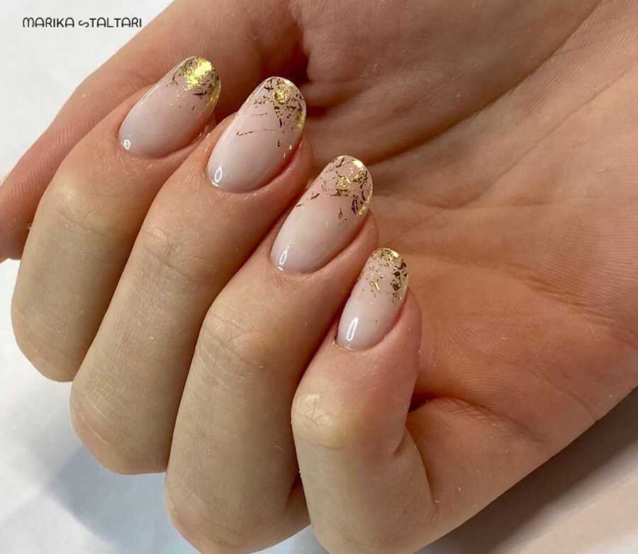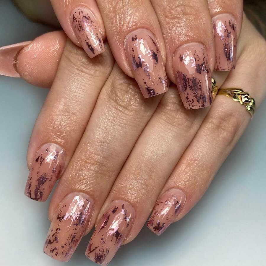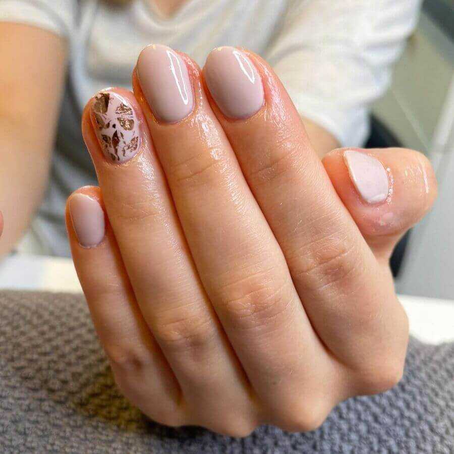 Нюд с фольгой. Нюд помогает сгладить яркость фольги и уравновешивает дизайн. В таком случае фольга наносится не на весь ноготь, а только сверху или снизу. Получается нежная и красивая абстракция. Отлично сочетается сусальная фольга (золотистая, серебристая) с бежевым оттенком. Можно попробовать и дополнительные элементы дизайна в виде страз.