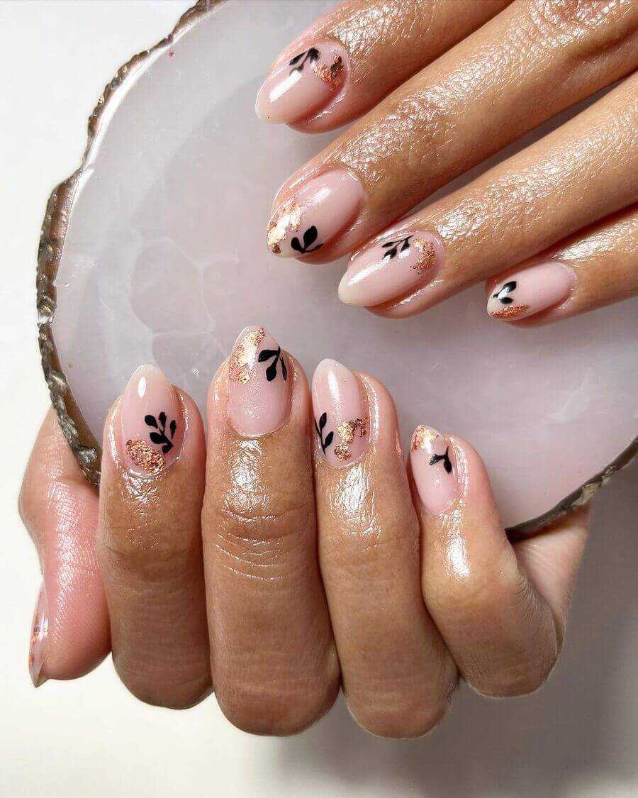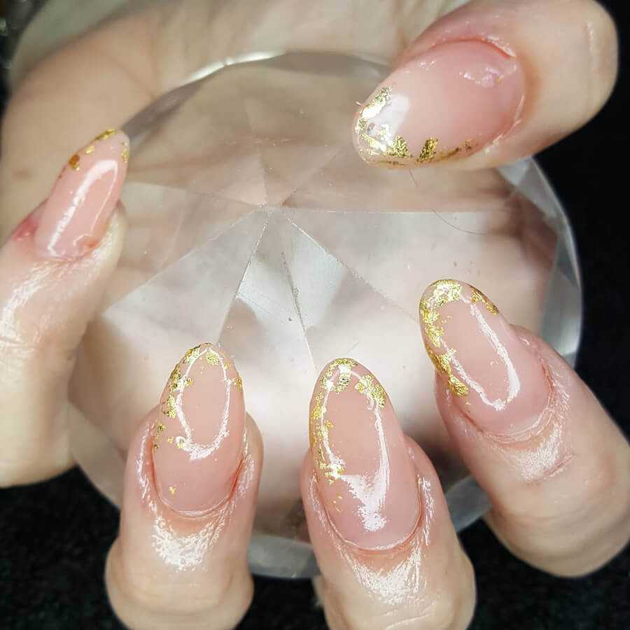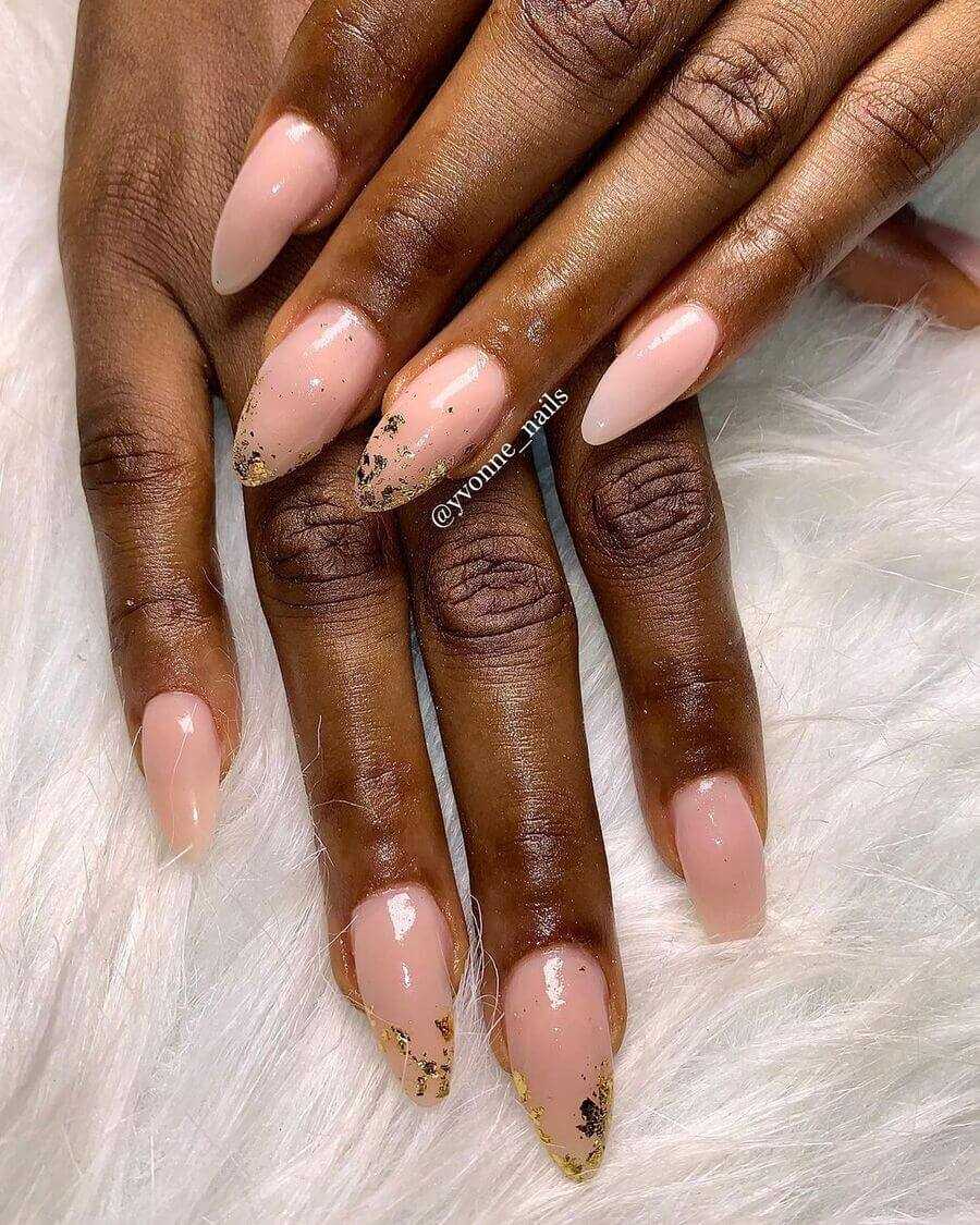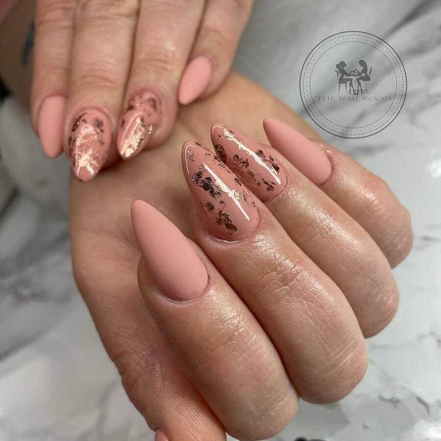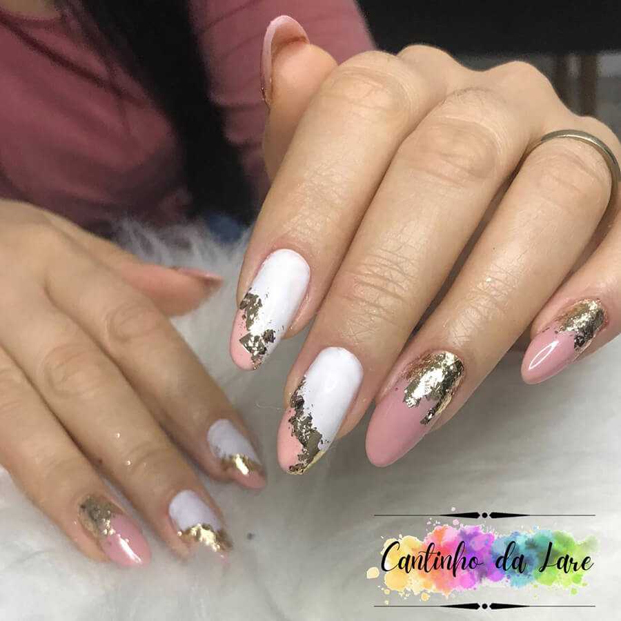 Нюд с фольгой. Нюд помогает сгладить яркость фольги и уравновешивает дизайн. В таком случае фольга наносится не на весь ноготь, а только сверху или снизу. Получается нежная и красивая абстракция. Отлично сочетается сусальная фольга (золотистая, серебристая) с бежевым оттенком. Можно попробовать и дополнительные элементы дизайна в виде страз.