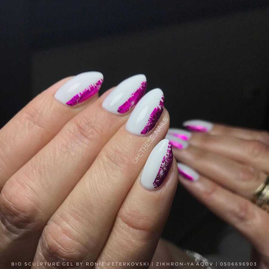Белое серебро. Еще одна тенденция — это наложение на ноготки серебряной фольги на чисто-белую или молочную основу. Можно использовать как глянцевый, так и матовый. Все зависит от ситуации. Глянец больше подойдет для праздничных мероприятий.
