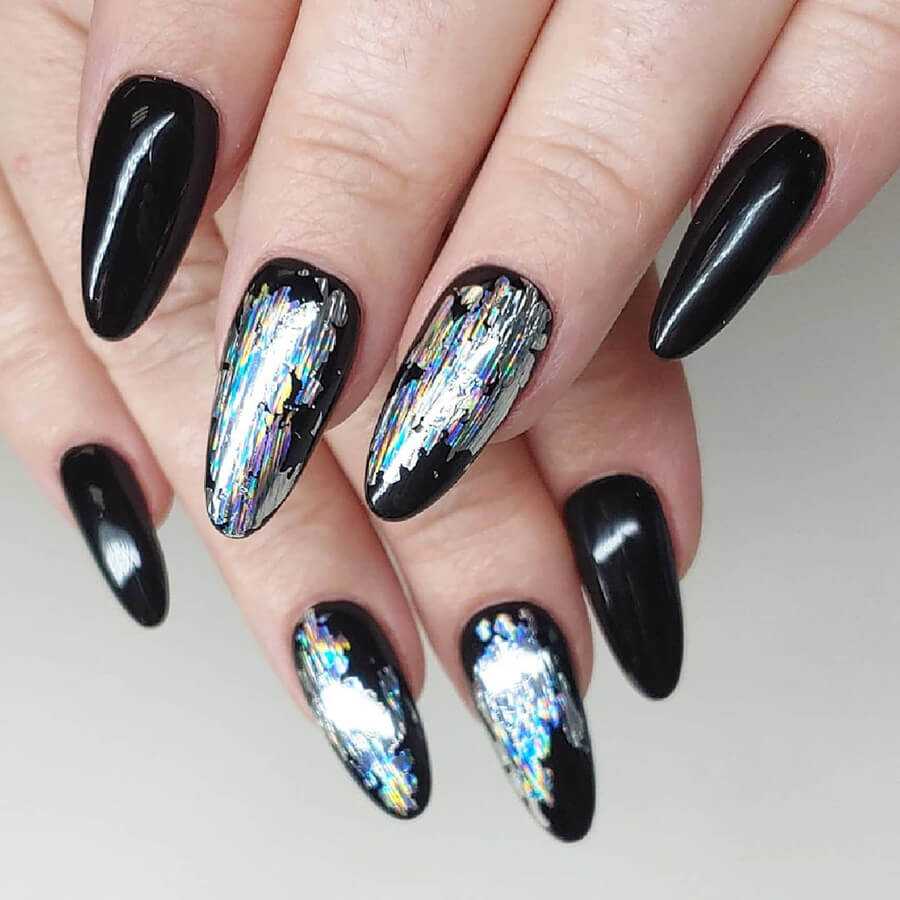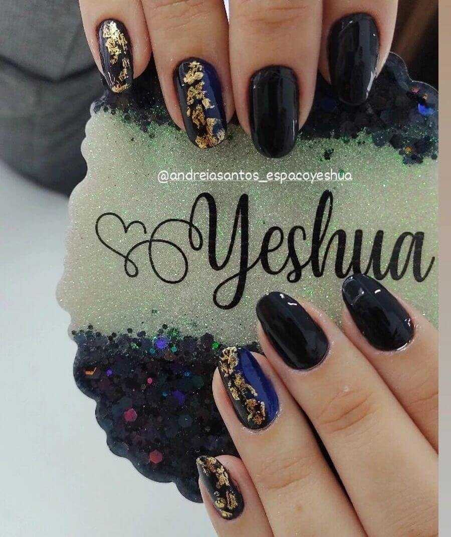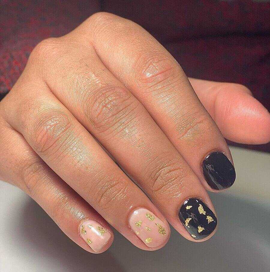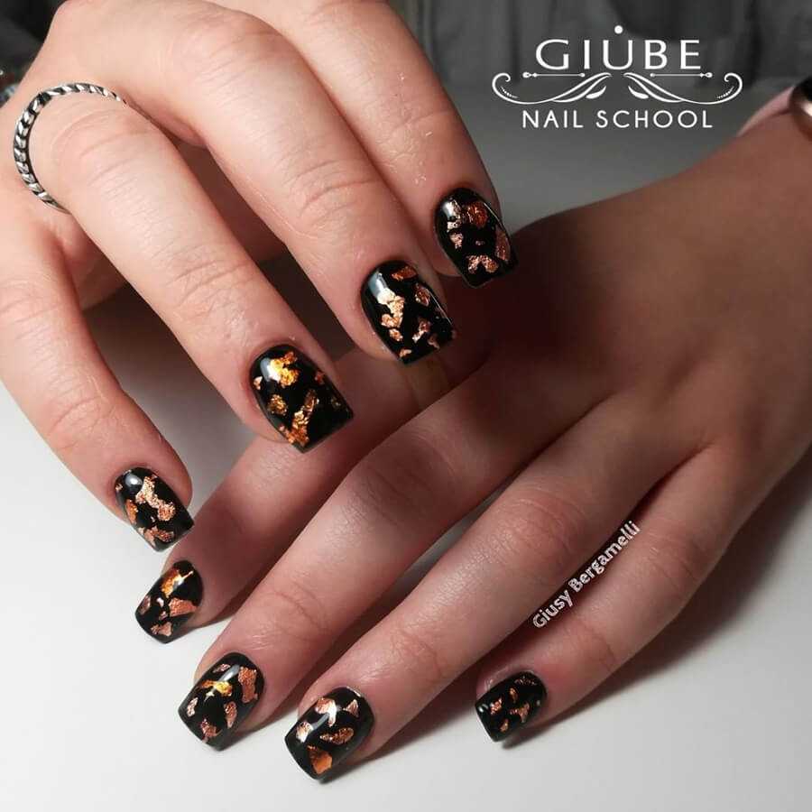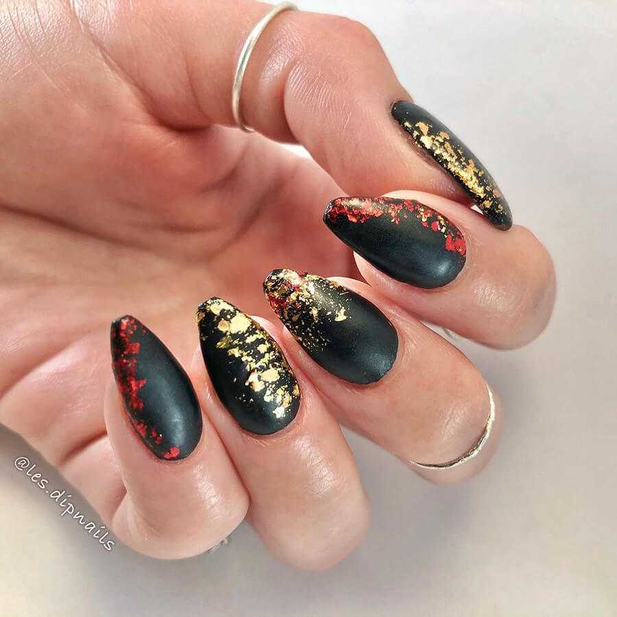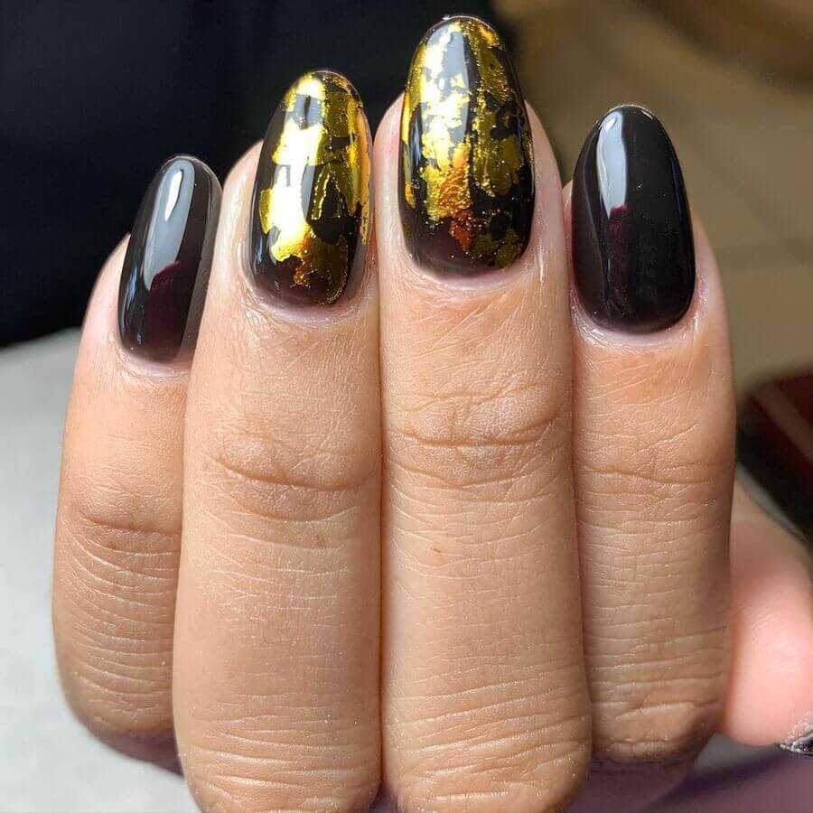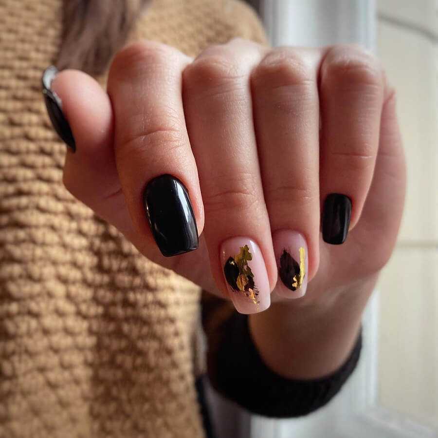 Черное золото. Еще один интересный праздничный и яркий Нейл-арт. Основа — черный цвет и золото. Элегантно и экстравагантно. Идеально для длинных или квадратных с закругленными кончиками. Такой вариант трендовых ногтей не нуждается в дополнительных украшениях. Хорошо подходит для создания вечернего образа.