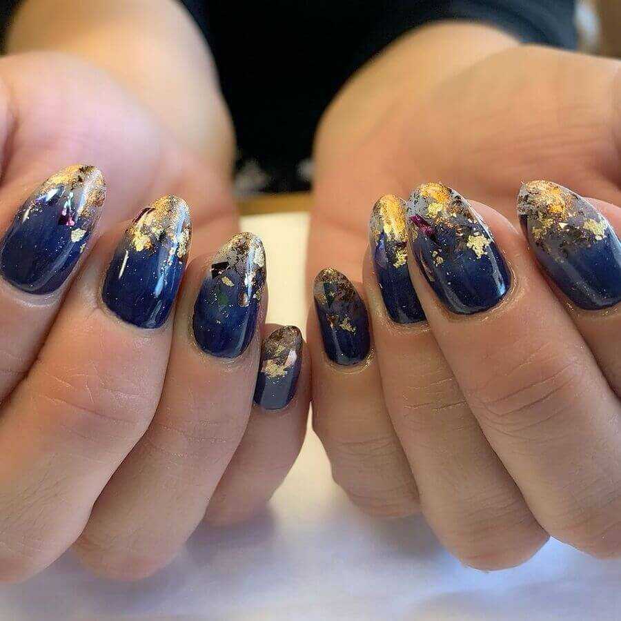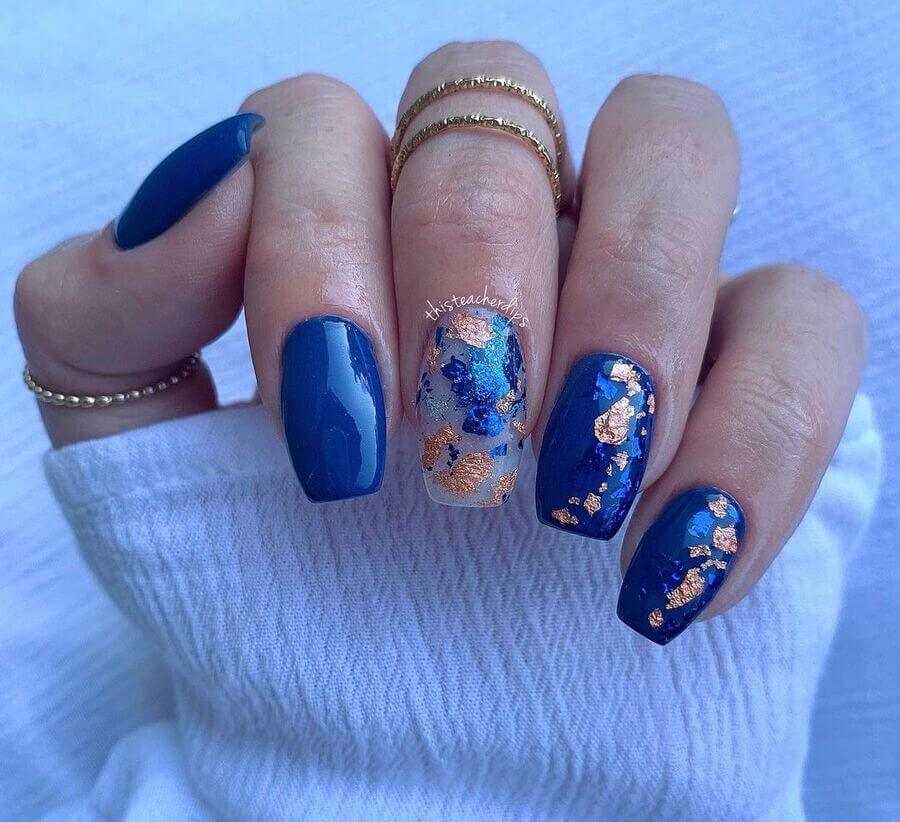 Синий цвет является одним из тех, которые не часто встретишь в качестве украшения женских ноготков. Не все современные красавицы могут позволить себе решиться на такой шаг. Ведь контраст синего цвета подходит не каждому. Но есть и такие представительницы, которые просто бредят этим цветом. Мастерам приходится проводить невероятные эксперименты по выполнению уникального маникюра. К синему оттенку лакового покрытия лучше всего подходит золотистый декор. Их сочетание имеет особую гармонию и шикарный вид. Основой, конечно же, выступает синий фон. Золотой цвет служит украшением в виде полос, рисунков или геометрических фигур. Невероятно красиво смотрится лунный маникюр, где золотым глиттером заполняется линия улыбки.