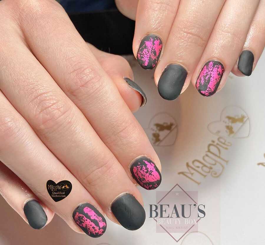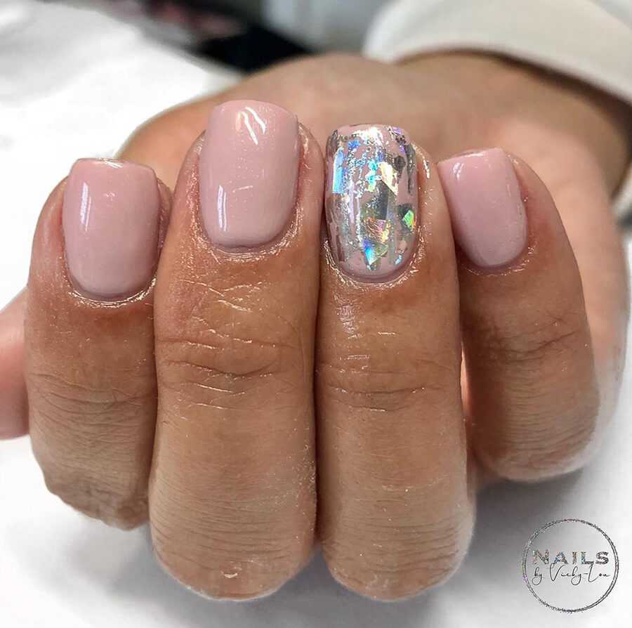 Если добавить кусочки фольги, то получится довольно лаконичный, но вместе с тем необычный и притягивающий внимание цвет. Вовсе не обязательно выполнять на все ногти