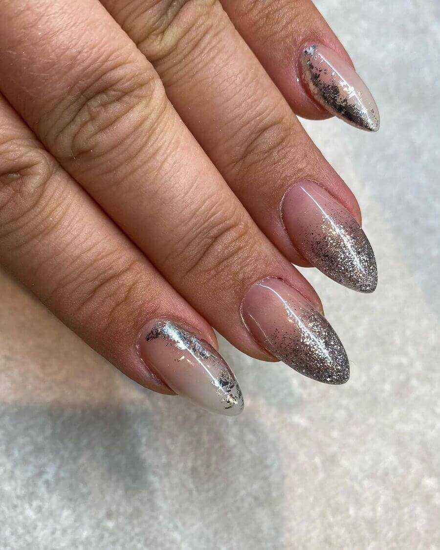 - лунный нейл-арт, выполненный серебристым лаком, будет удачно сочетаться с серебряной фольгой на 2-3 пальчиках;