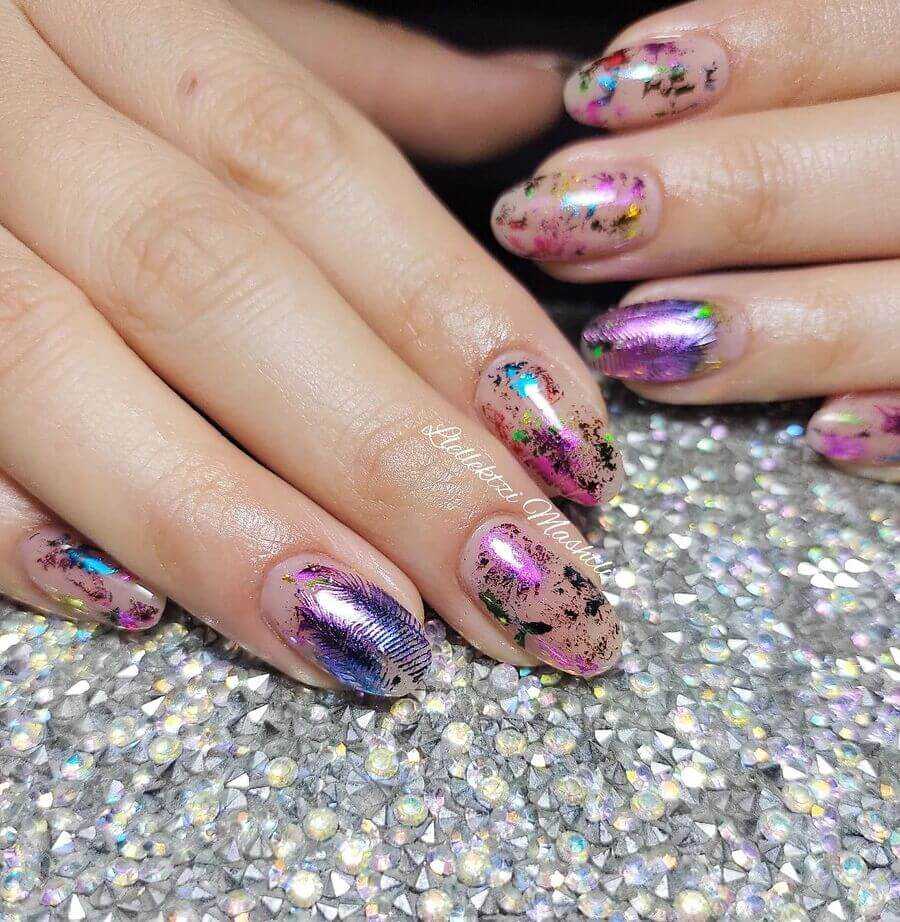 - Нанести кусочки фольги на ноготь. Делают это в произвольном порядке. Можно закрыть всю пластину ногтя полностью. Варианты дизайна ограничиваются исключительно фантазией.