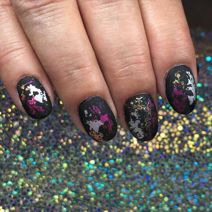 Если вы хотите, чтобы цветная база была не глянцевой, а матовой — перед нанесением кусочков металла покройте ноготь матовым топовым составом. Такой маникюр будет более изысканным и необычным.