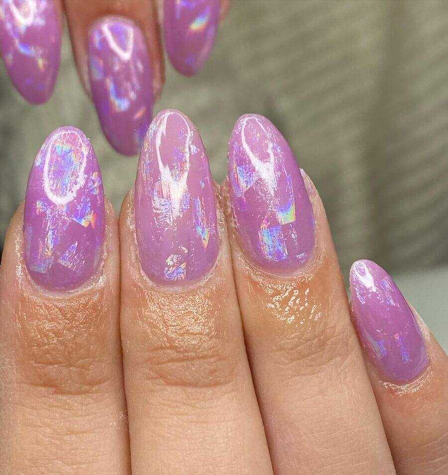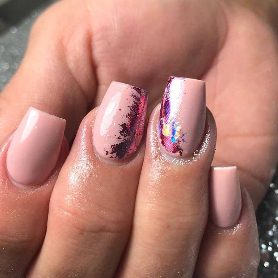 Создавая маникюр с фольгой на короткие ногти, стоит обратить внимание на этот дизайн. Для него потребуется всего один оттенок гель-лака и голографическая фольга
