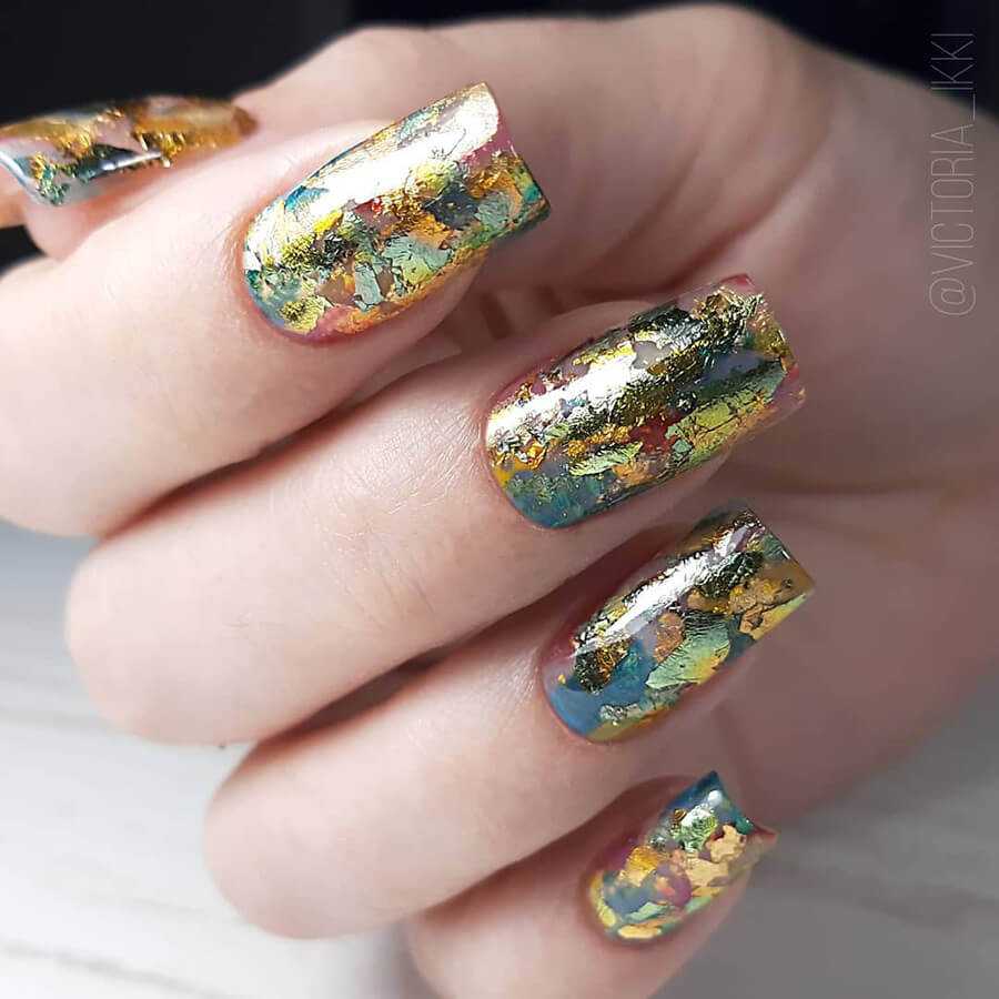 Этот дизайн удастся воплотить при наличии как минимум 2х оттенков фольги, например, серебристого и коричневого цвета. На ноготок, покрытый гель-лаком контрастного оттенка, например, зеленого, отпечатывается сначала серебристая фольга, а затем, на пустых участках, коричневая. Чтобы добиться эффекта камуфляжа, старайтесь хаотично расставлять блестящие отпечатки на ноготке. В завершении ногтевую пластину покрывают топом.